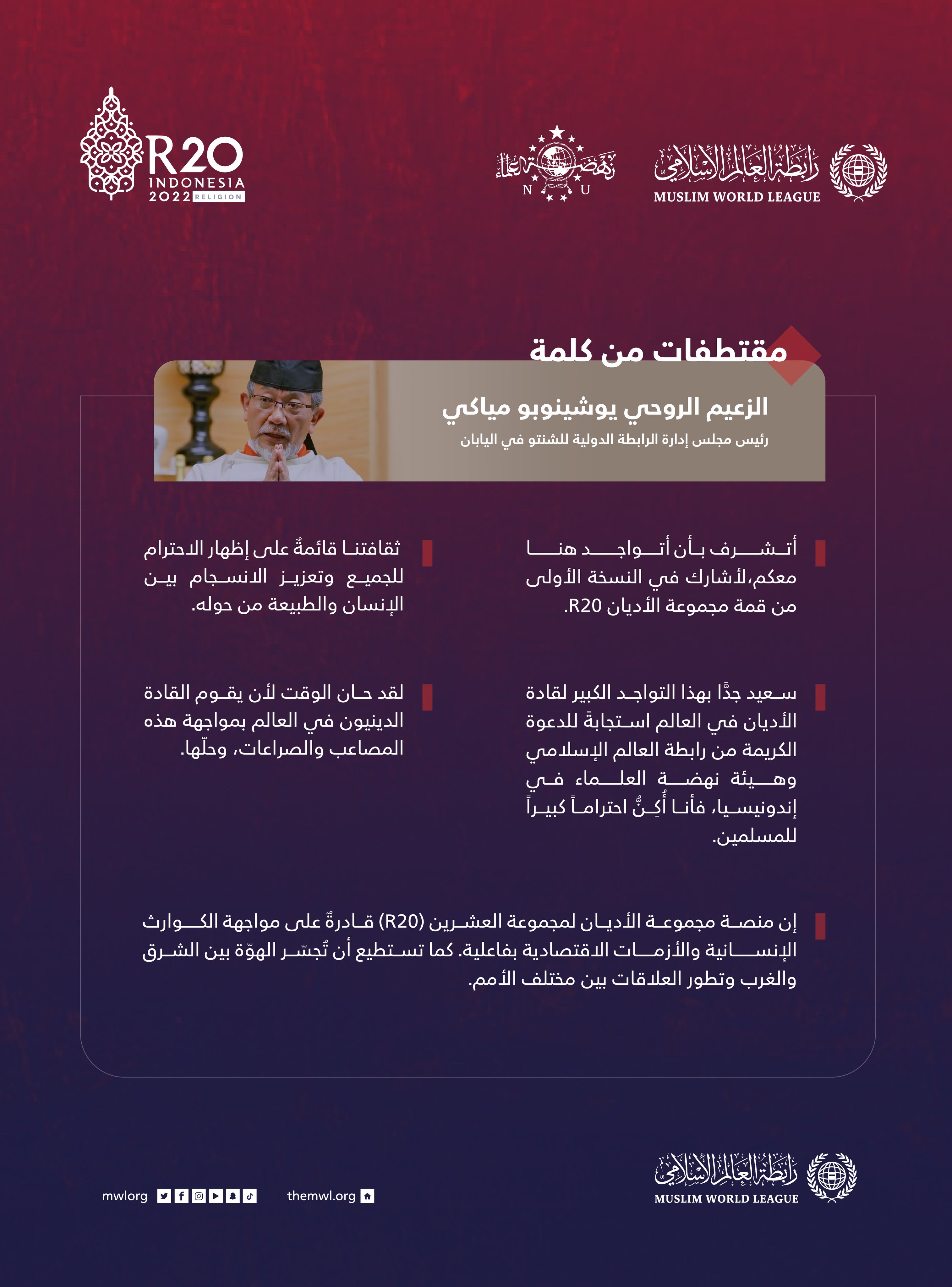 أبرز النقاط التي تطرّق إليها رئيس مجلس إدارة الرابطة الدولية للشنتو في اليابان، الزعيم الروحي العالمي يوشينوبو مياكي، خلال أعمال القمة الدينية لمجموعة العشرين في بالي: