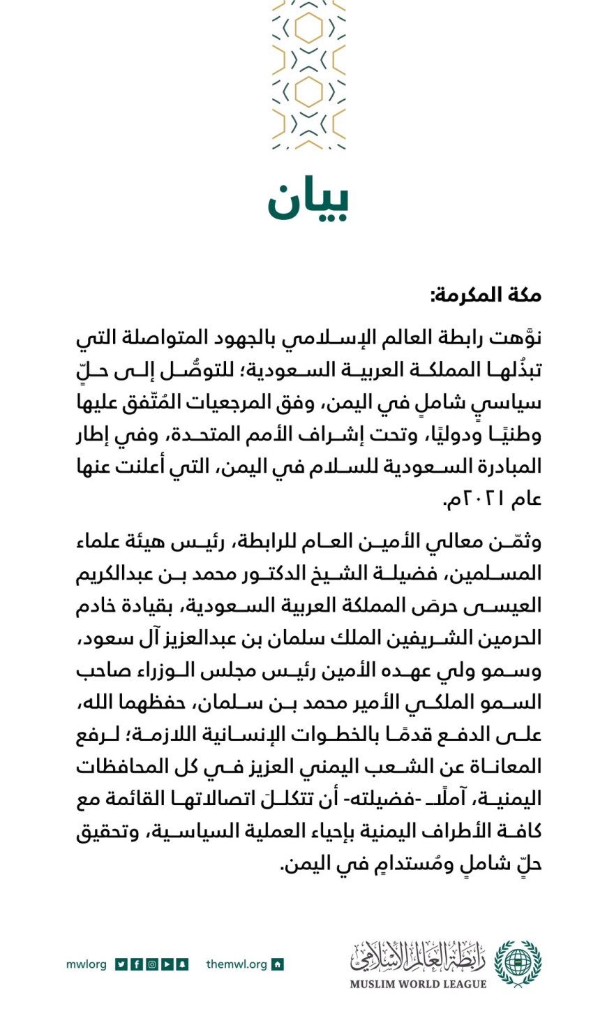 نوَّهت رابطة العالم الإسلامي بالجهود المتواصلة التي تبذُلها المملكة العربية السعودية؛ للتوصُّل إلى حلٍّ سياسيٍ شاملٍ في اليمن، وفق المرجعيات المُتّفق عليها وطنيًا ودوليًا، وتحت إشراف الأمم المتحدة، وفي إطار المبادرة السعودية للسلام في اليمن، التي أعلنت عنها عام 2021م.