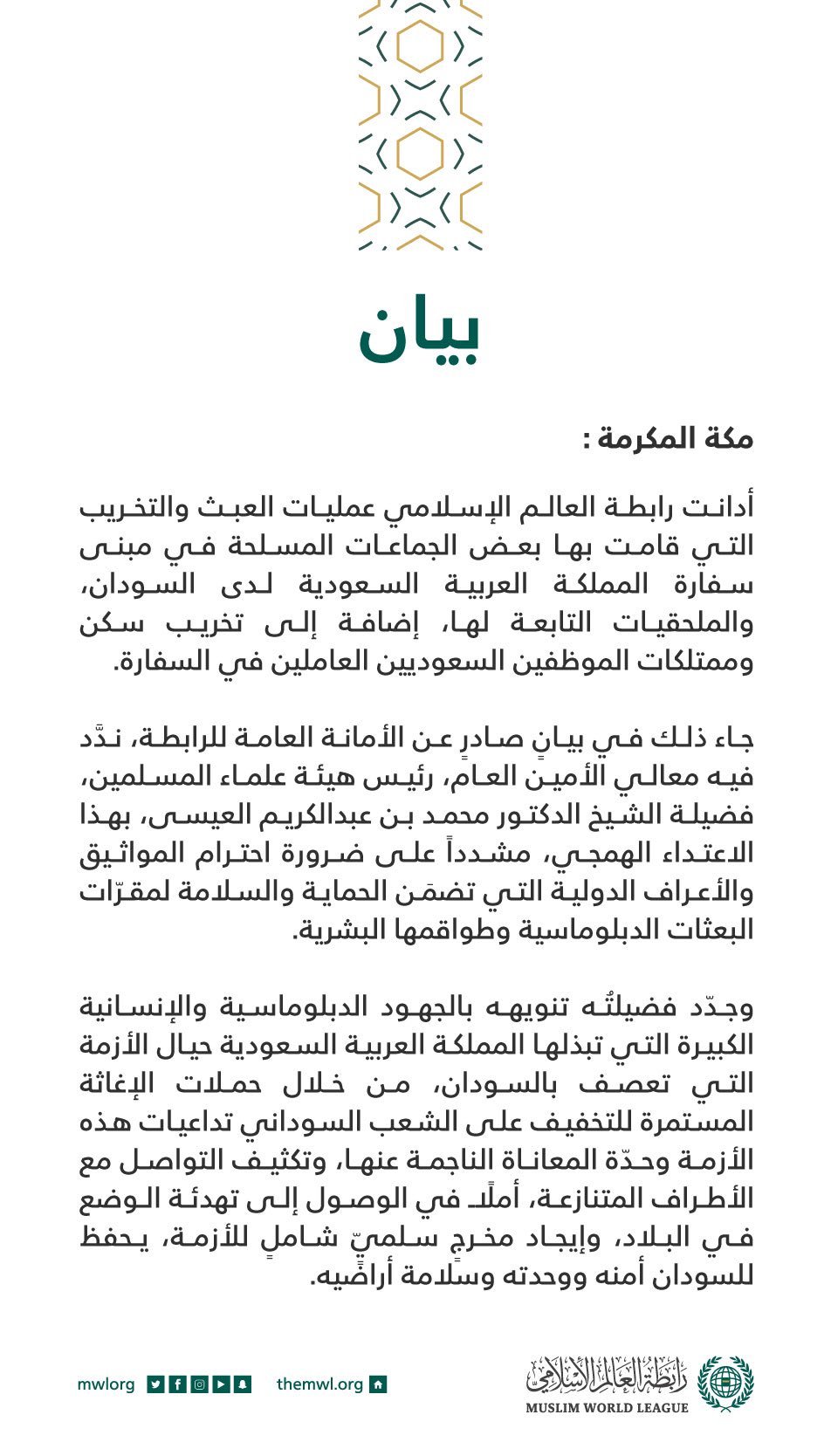 أدانت رابطة العالم الإسلامي عمليات العبث والتخريب التي قامت بها بعض الجماعات المسلحة في مبنى سفارة المملكة العربية السعودية لدى السودان، والملحقيات التابعة لها، إضافة إلى تخريب سكن وممتلكات الموظفين السعوديين العاملين في السفارة.