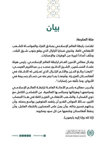 جاء ذلك في بيانٍ صادرٍ عن الأمانة العامة للرابطة، ندَّد فيه معالي الأمين العام، رئيس هيئة علماء المسلمين، فضيلة الشيخ الدكتور محمد بن عبدالكريم العيسى، بهذا الاعتداء الهمجي، مشدداً على ضرورة احترام المواثيق والأعراف الدولية التي تضمَن الحماية والسلامة لمقرّات البعثات الدبلوماسية وطواقمها البشرية.