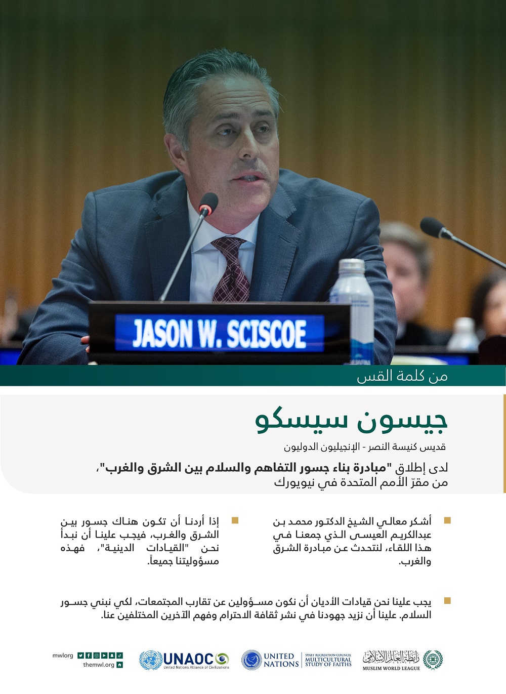 مقتطفات من كلمة القس جيسون سيسكو، قديس كنيسة النصر - الأنجيليون الدوليون، لدى إطلاق مبادرة رابطة العالم الإسلامي لـ "بناء جسور التفاهم والسلام بين الشرق والغرب" من مقر الأمم المتحدة بنيويورك: