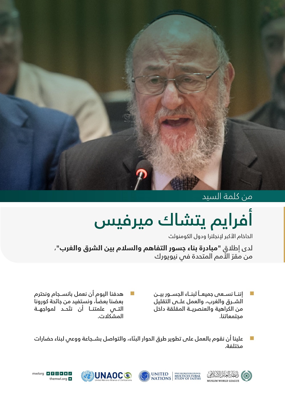 مقتطفات من كلمة السيد أفرايم يتشاك ميرفيس، الحاخام الأكبر لإنجلترا ودول الكومنولث، لدى إطلاق مبادرة رابطة العالم الإسلامي لـ "بناء جسور التفاهم والسلام بين الشرق والغرب" من مقر الأمم المتحدة بنيويورك