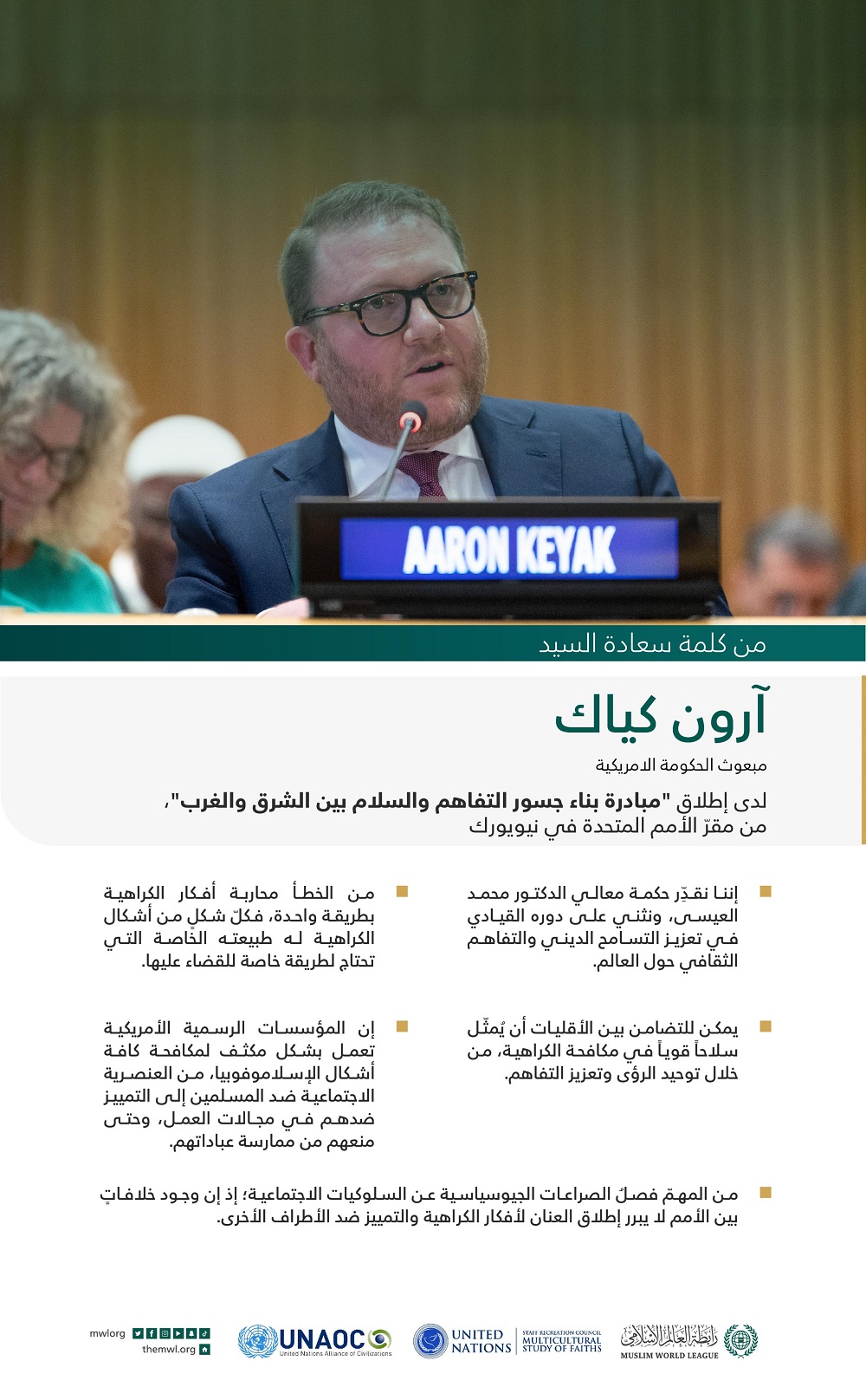 مقتطفات من كلمة سعادة السيد آرون كياك، مبعوث الحكومة الأمريكية، لدى إطلاق مبادرة رابطة العالم الإسلامي لـ "بناء جسور التفاهم والسلام بين الشرق والغرب" من مقر الأمم المتحدة بنيويورك