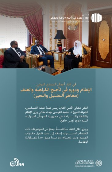 التقى معالي الأمين العام، رئيس هيئة علماء المسلمين، فضيلة الشيخ د. محمد العيسى بجدة، معالي وزير الإعلام والثقافة والسياحة في جمهورية الصومال الفيدرالية، السيد داوود…