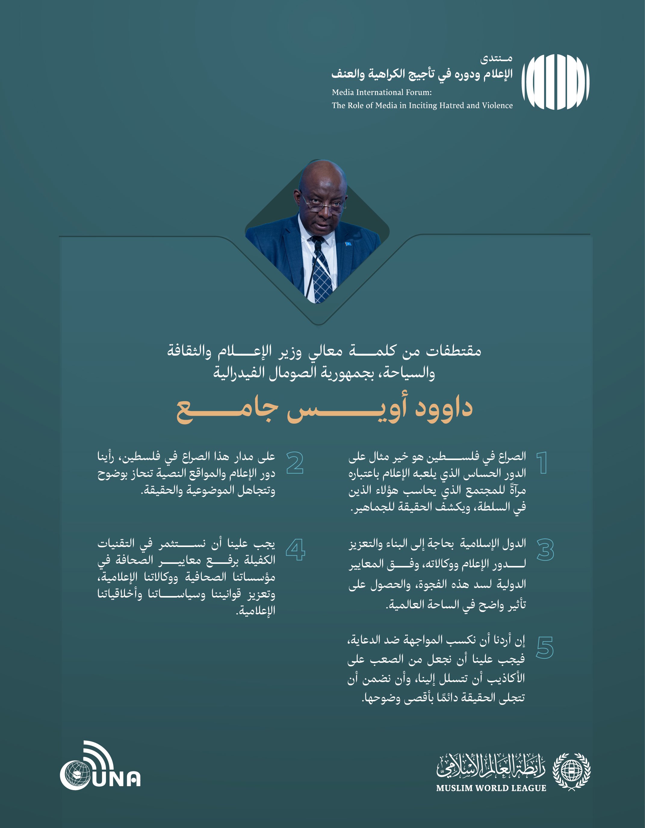 من كلمة معالي وزير الإعلام والثقافة والسياحة لجمهورية الصومال الفيدرالية، السيد داوود أويس جامع، في المنتدى الدولي: "الإعلام ودوره في تأجيج الكراهية والعنف: مخاطر التضليل والتحيُّز":