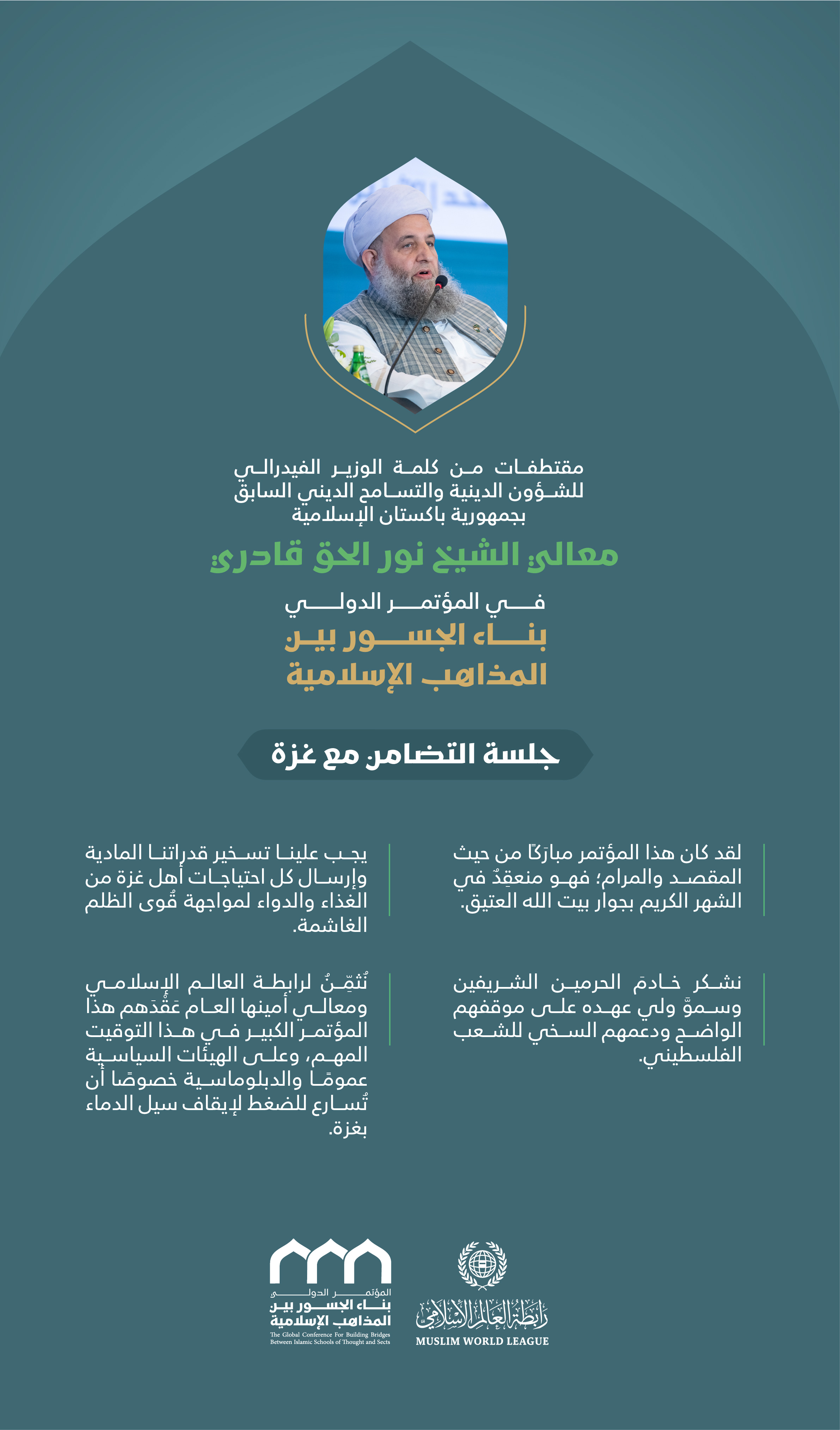 مقتطفاتٌ من كلمة معالي الوزير الفيدرالي للشؤون الدينية والتسامح الديني السابق بجمهورية باكستان الإسلامية، الشيخ نور الحق قادري، خلال وقفة "التضامن مع غزة" في المؤتمر الدولي: "بناء الجسور بين المذاهب الإسلامية".