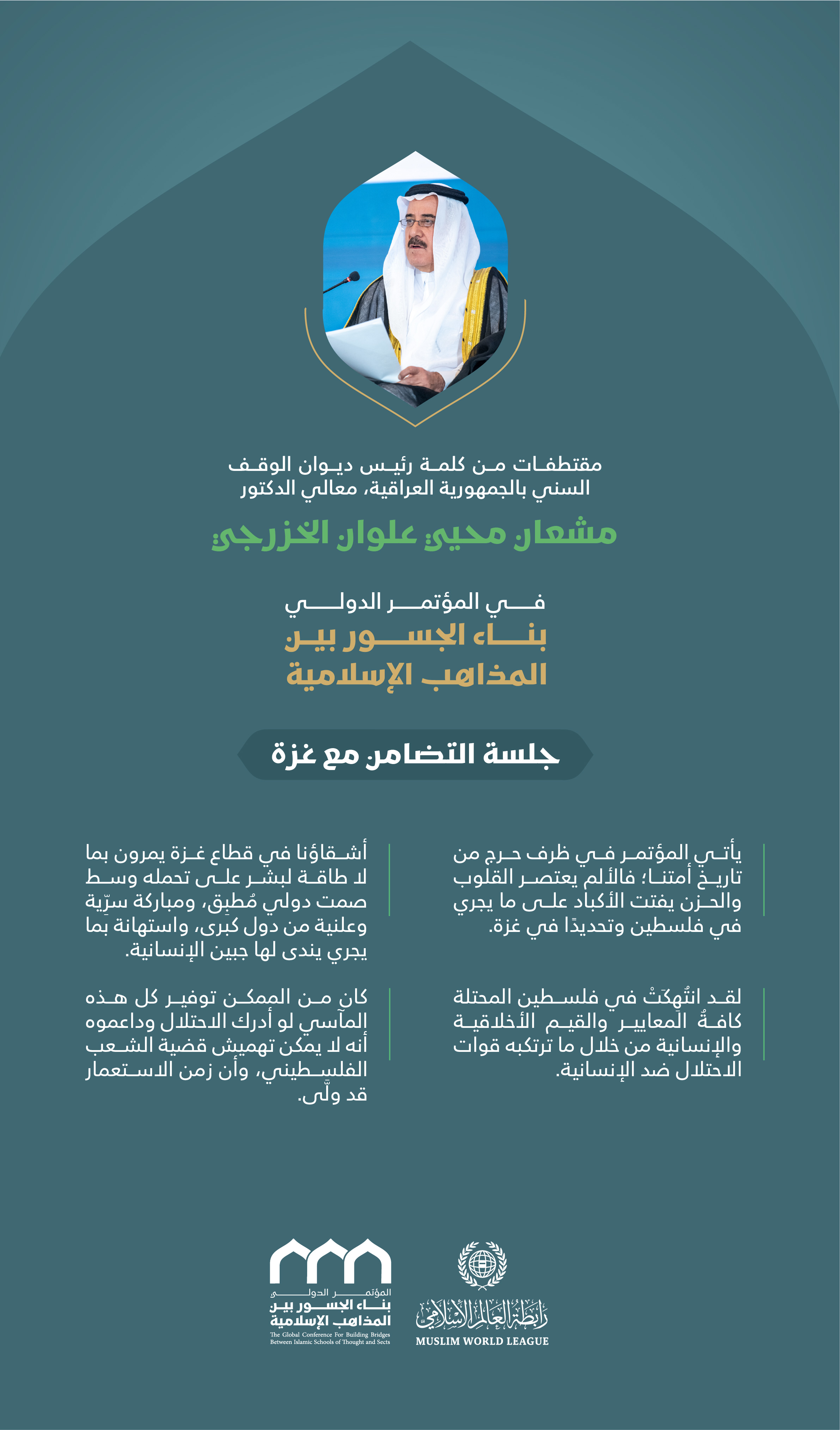 ‏مقتطفات من كلمة معالي رئيس ديوان الوقف السني بالجمهورية العراقية، الدكتور مشعان محيي علوان الخزرجي، خلال وقفة "التضامن مع غزة" في المؤتمر الدولي: "بناء الجسور بين المذاهب الإسلامية".