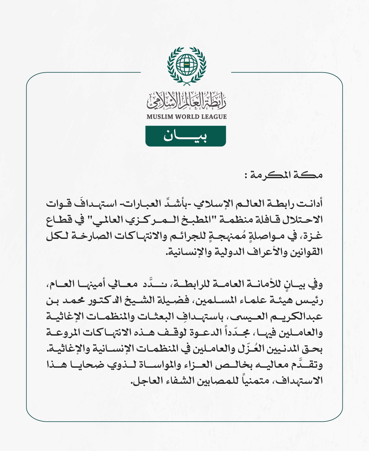 ‏أدانت رابطة العالم الإسلامي -بأشدِّ العبارات- استهدافَ قوات الاحتلال قافلة منظمة "المطبخ المركزي العالمي" في قطاع غزة، في مواصلةٍ مُمنهجةٍ للجرائم والانتهاكات الصارخة لكل القوانين والأعراف الدولية والإنسانية.