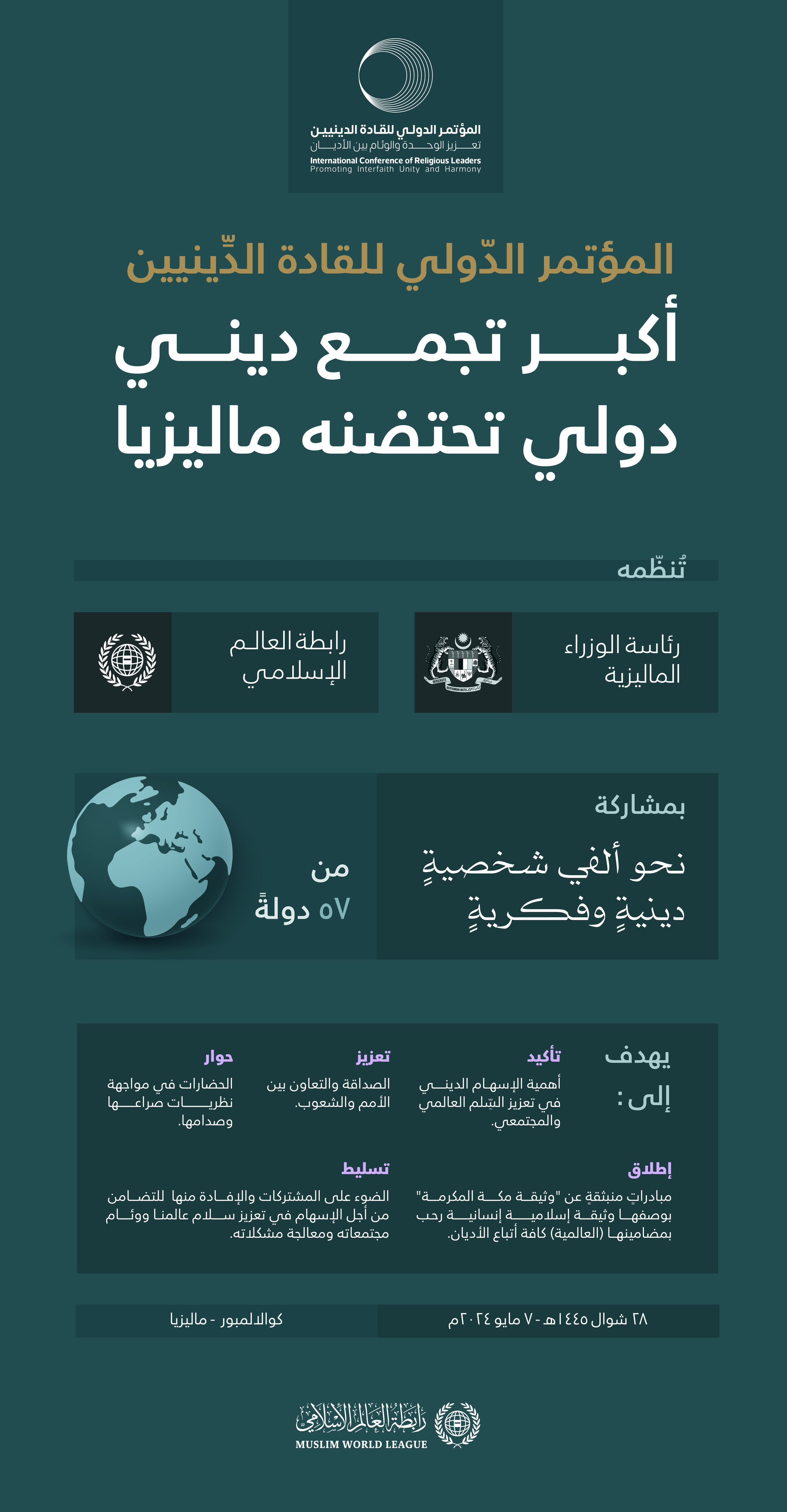 أضخمُ حدَثٍ دينيّ دوليّ في قارة آسيا، ونحو ألفي مشاركةٍ من ٥٧ دولة: ترقّبوا غداً .. انطلاق أعمال "الموتمر الدولي للقادة الدينيين" في كوالامبور، بالشراكة بين رئاسة الوزراء الماليزية ورابطة العالم الإسلامي: