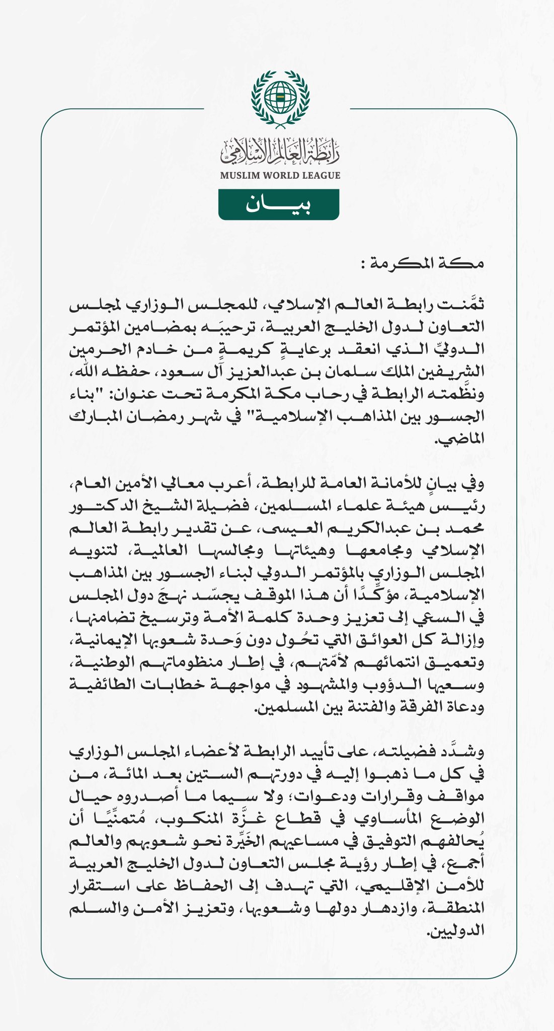 ثمَّنت رابطة العالم الإسلامي، للمجلس الوزاري لمجلس التعاون لدول الخليج العربية، ترحيبَه بمضامين المؤتمر الدوليِّ الذي انعقد برعايةٍ كريمةٍ من خادم الحرمين الشريفين الملك سلمان بن عبدالعزيز آل سعود، حفظه الله، ونظَّمته الرابطة في رحاب مكة المكرمة تحت عنوان: "بناء الجسور بين المذاهب الإسلامية" في شهر رمضان المبارك الماضي.