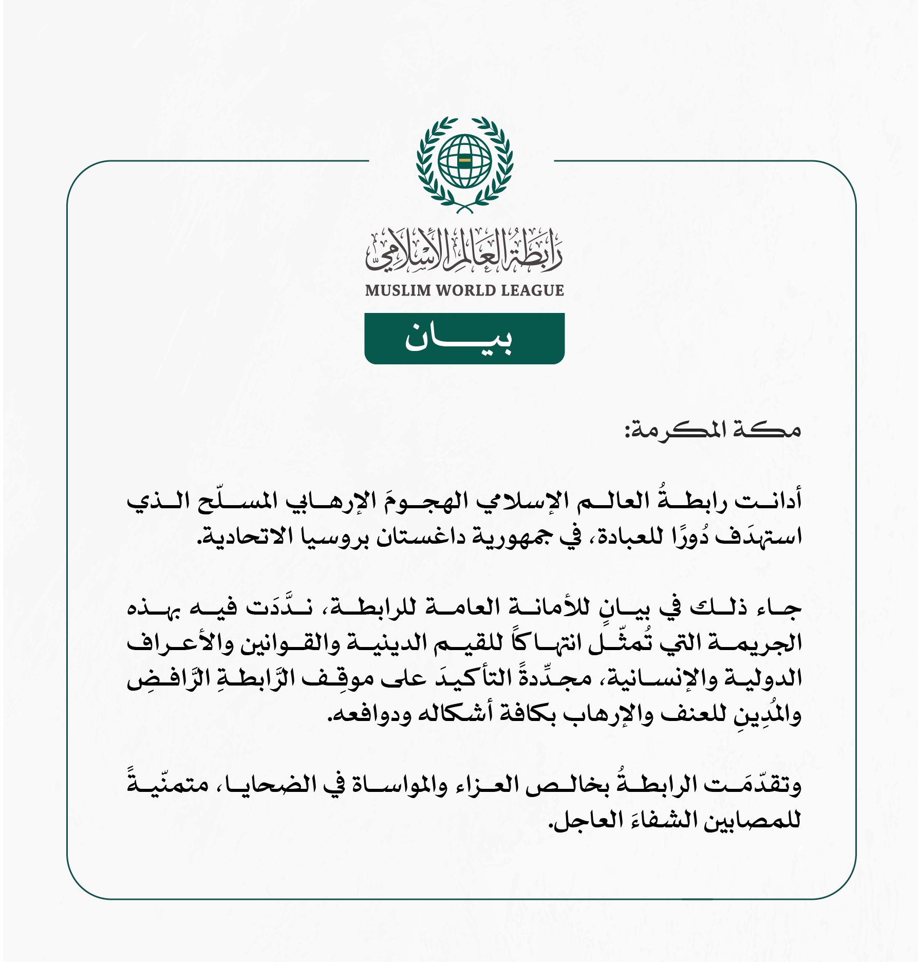 أدانت رابطةُ العالم الإسلامي الهجومَ الإرهابي المسلّح الذي استهدَف دُورًا للعبادة، في جمهورية داغستان بروسيا الاتحادية.
