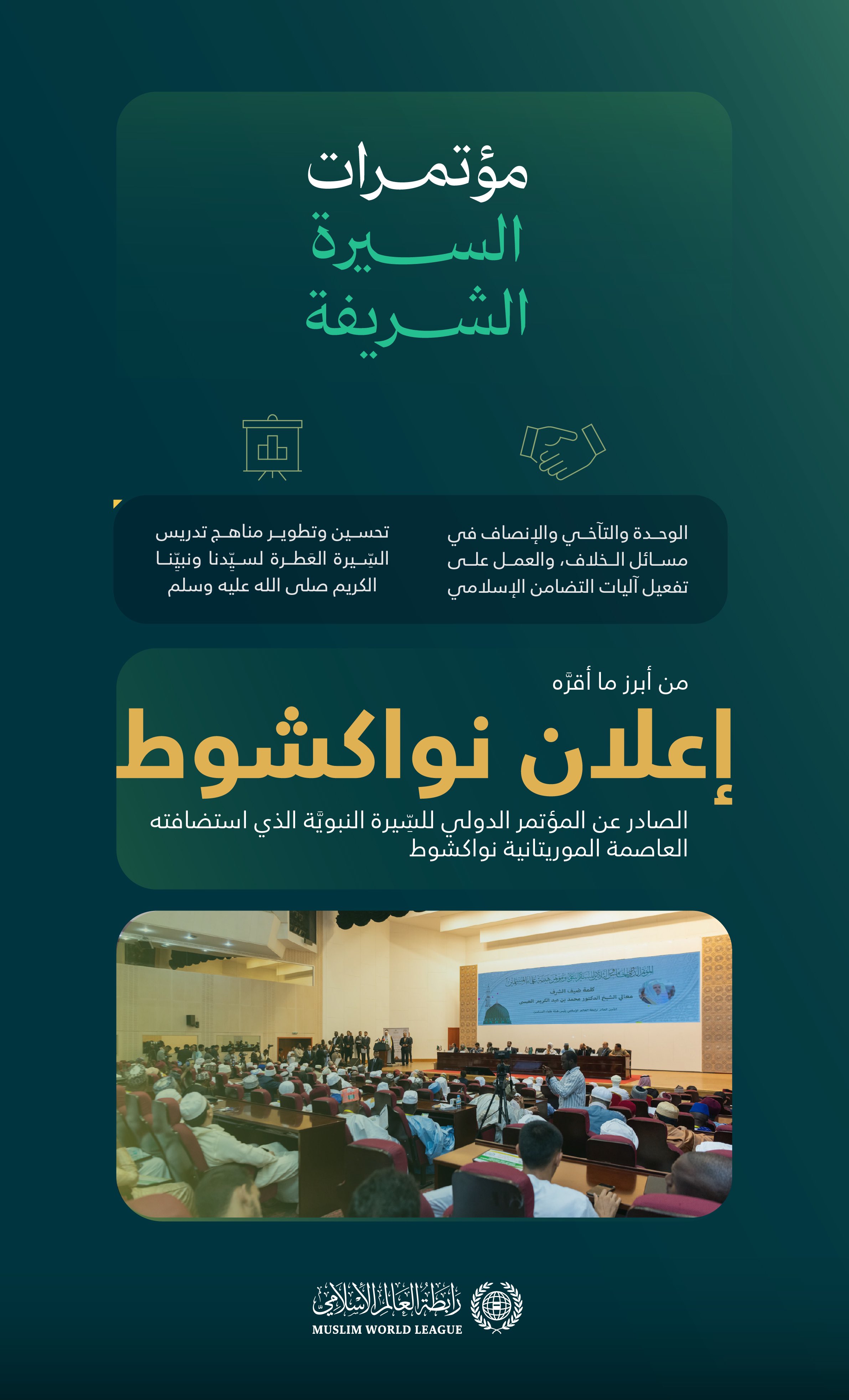 ‏شهِد مؤتمر السيرة النبوية في موريتانيا لعام ١٤٤٥هـ، حضورَ جَمعٍ غفير من علماء ومُفتين ومفكرين من 55 دولة إسلامية، واقترحت ⁧‫رابطة العالم الإسلامي‬⁩ في ختام أعماله: "إعلان نواكشوط"، ولاقى استحسان ضيوف المؤتمر، وهاهنا مقتطفاتٌ من أبرز مُخرجاته التي تَعمل عليها الرابطة "في مناطق الاحتياج" في عالمنا الإسلامي ودول الأقليات، بالتعاون مع المؤسسات "الرسمية" المختصة، ورابطة الجامعات الإسلامية: