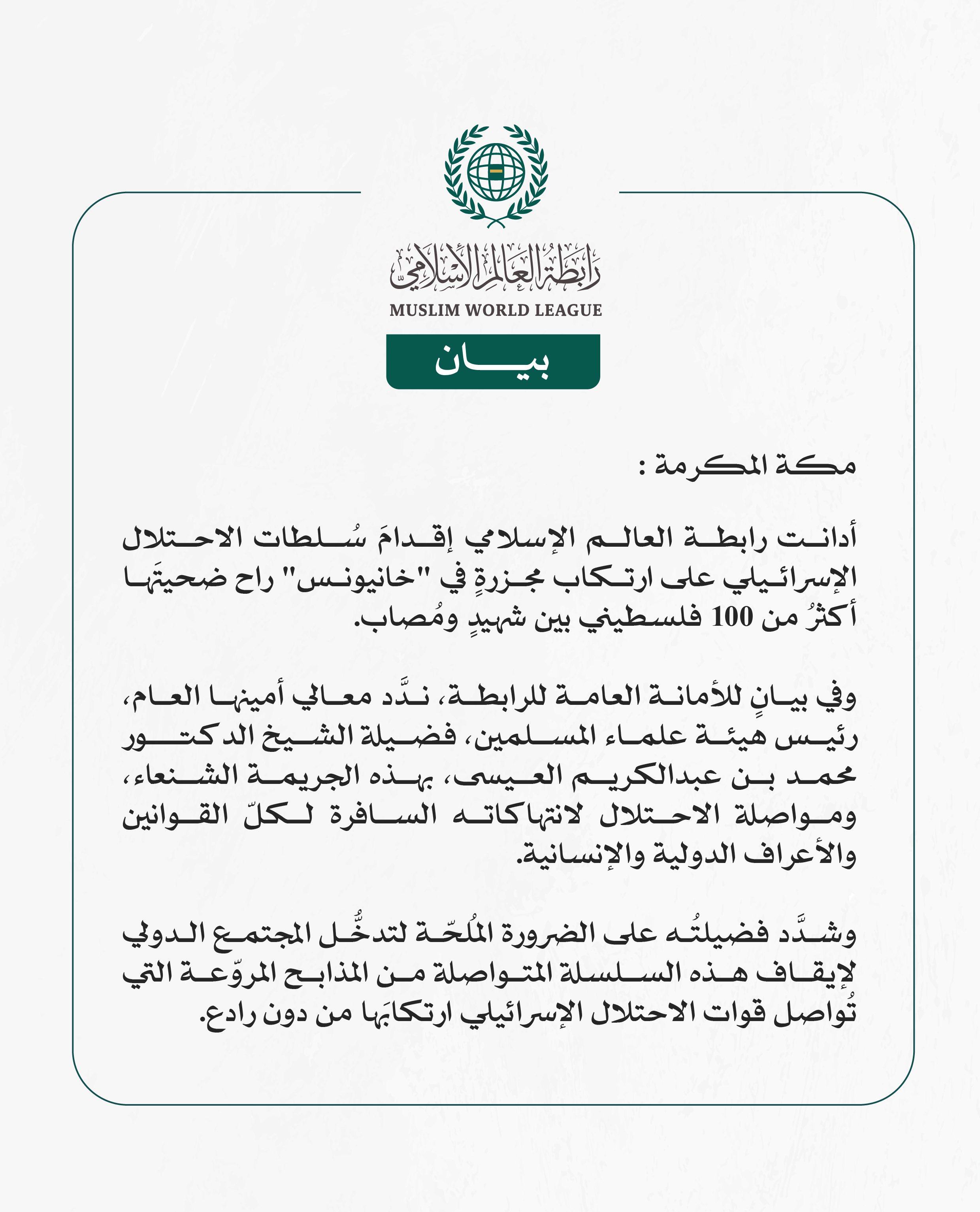 أدانت رابطة العالم الإسلامي إقدامَ سُلطات الاحتلال الإسرائيلي على ارتكاب مجزرةٍ في "خانيونس" راح ضحيتَها أكثرُ من 100 فلسطيني بين شهيدٍ ومُصاب.
