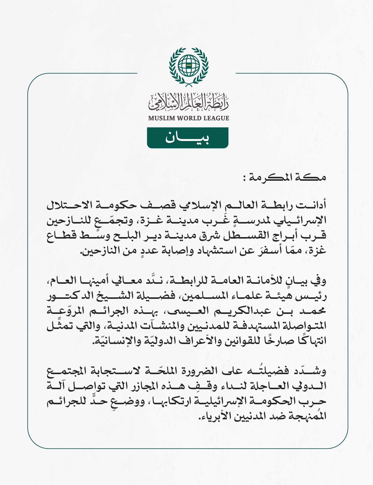 أدانت رابطة العالم الإسلامي قصف حكومة الاحتلال الإسرائيلي لمدرسةٍ غَرب مدينة غزة، وتجمّعٍ للنازحين قرب أبراج القسطل شرق مدينة دير البلح وسط قطاع غزة، ممّا أسفرَ عن استشهاد وإصابة عددٍ من النازحين.
