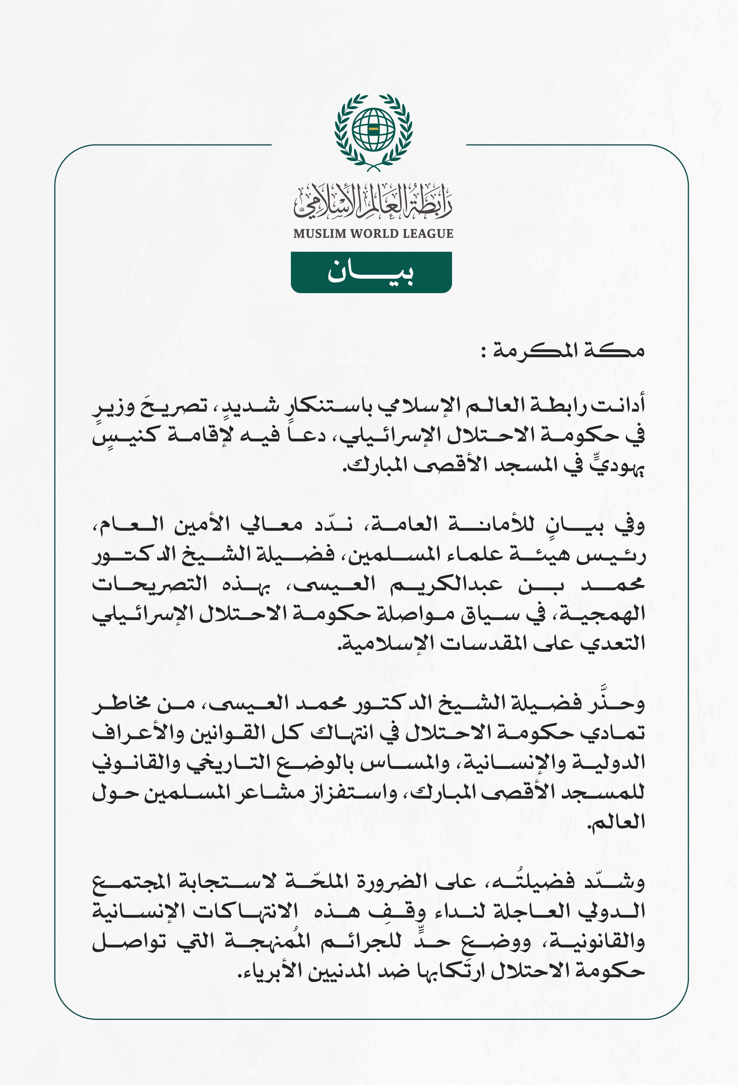 أدانت رابطة العالم الإسلامي باستنكارٍ شديدٍ، تصريحَ وزيرٍ في حكومة الاحتلال الإسرائيلي، دعا فيه لإقامة كنيسٍ يهوديٍّ في المسجد الأقصى المبارك.