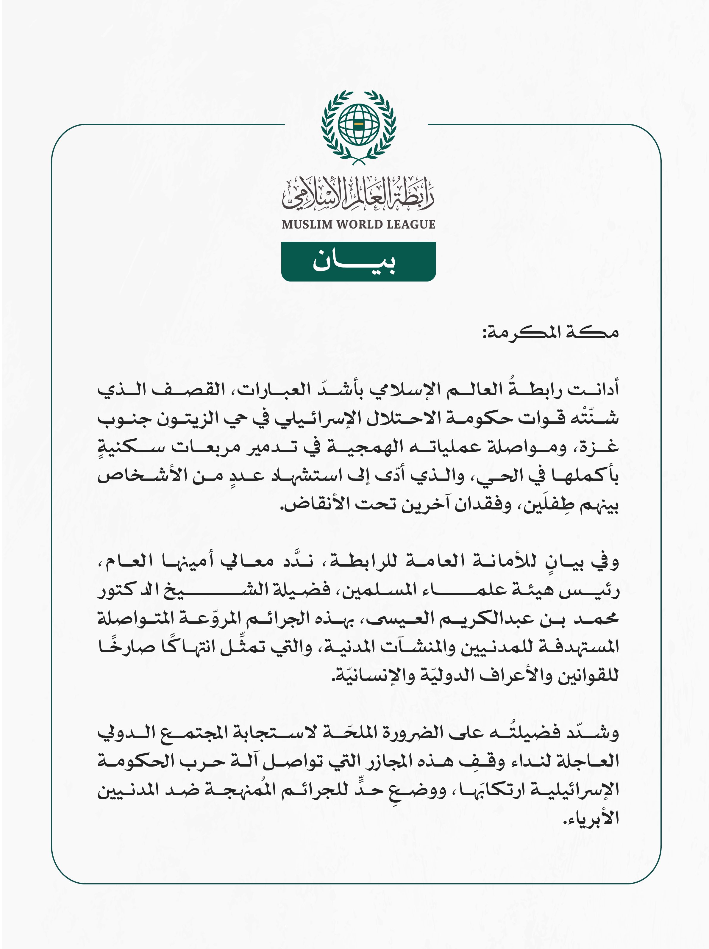 أدانت رابطةُ العالم الإسلامي بأشدّ العبارات، القصف الذي شنّتْه قوات حكومة الاحتلال الإسرائيلي في حي الزيتون جنوب غزة، ومواصلة عملياته الهمجية في تدمير مربعات سكنيةٍ بأكملها في الحي، والذي أدّى إلى استشهاد عددٍ من الأشخاص بينهم طِفلَين، وفقدان آخرين تحت الأنقاض.