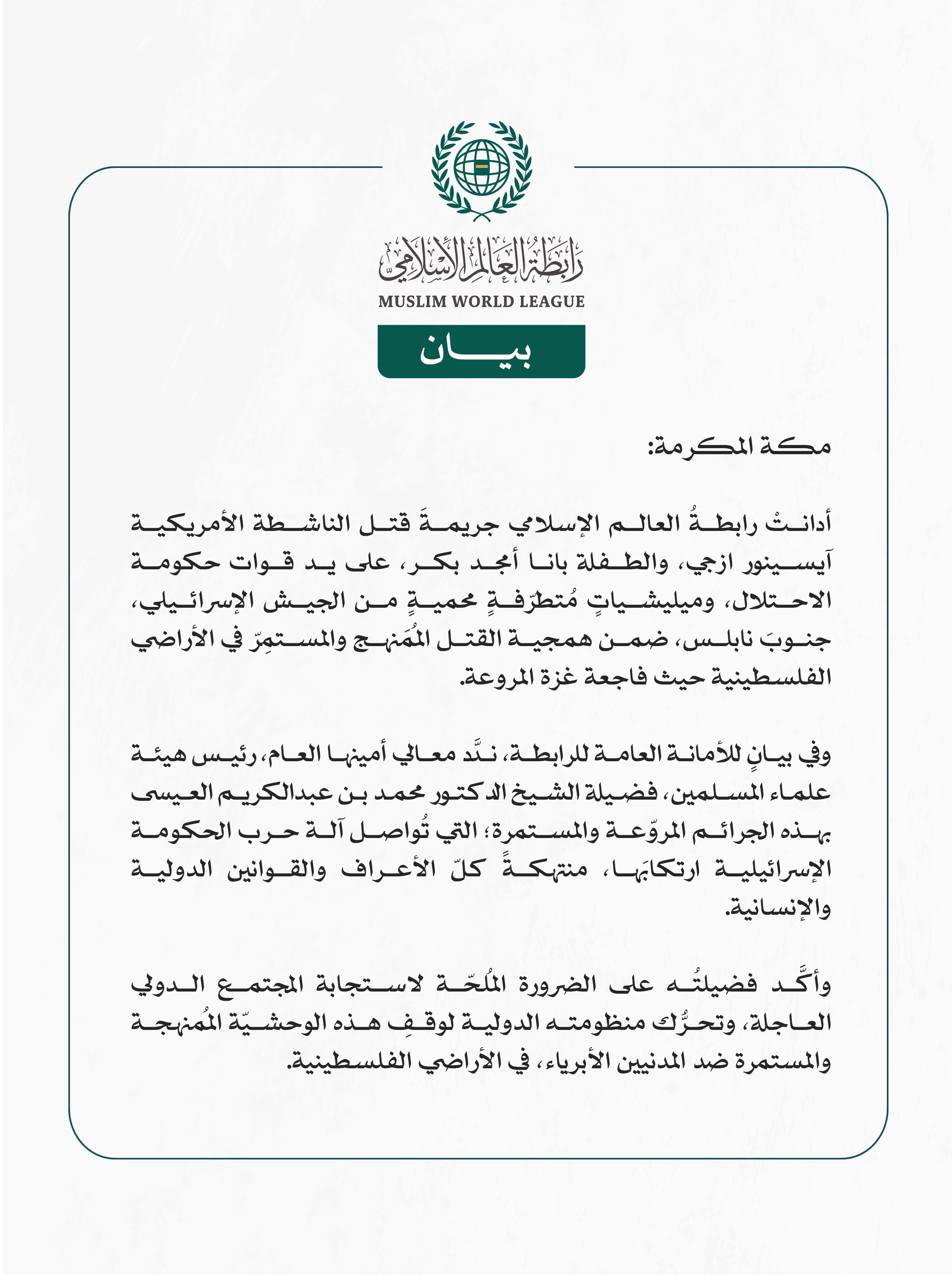رابطةُ العالم الإسلامي تُدين جريمةَ قتل الناشطة الأمريكية آيسينور ازجي، والطفلة بانا أمجد بكر على يد قوات حكومة الاحتلال الإسرائيلي ضمن همجية القتل المُمَنهج والمستمر في الأراضي الفلسطينية