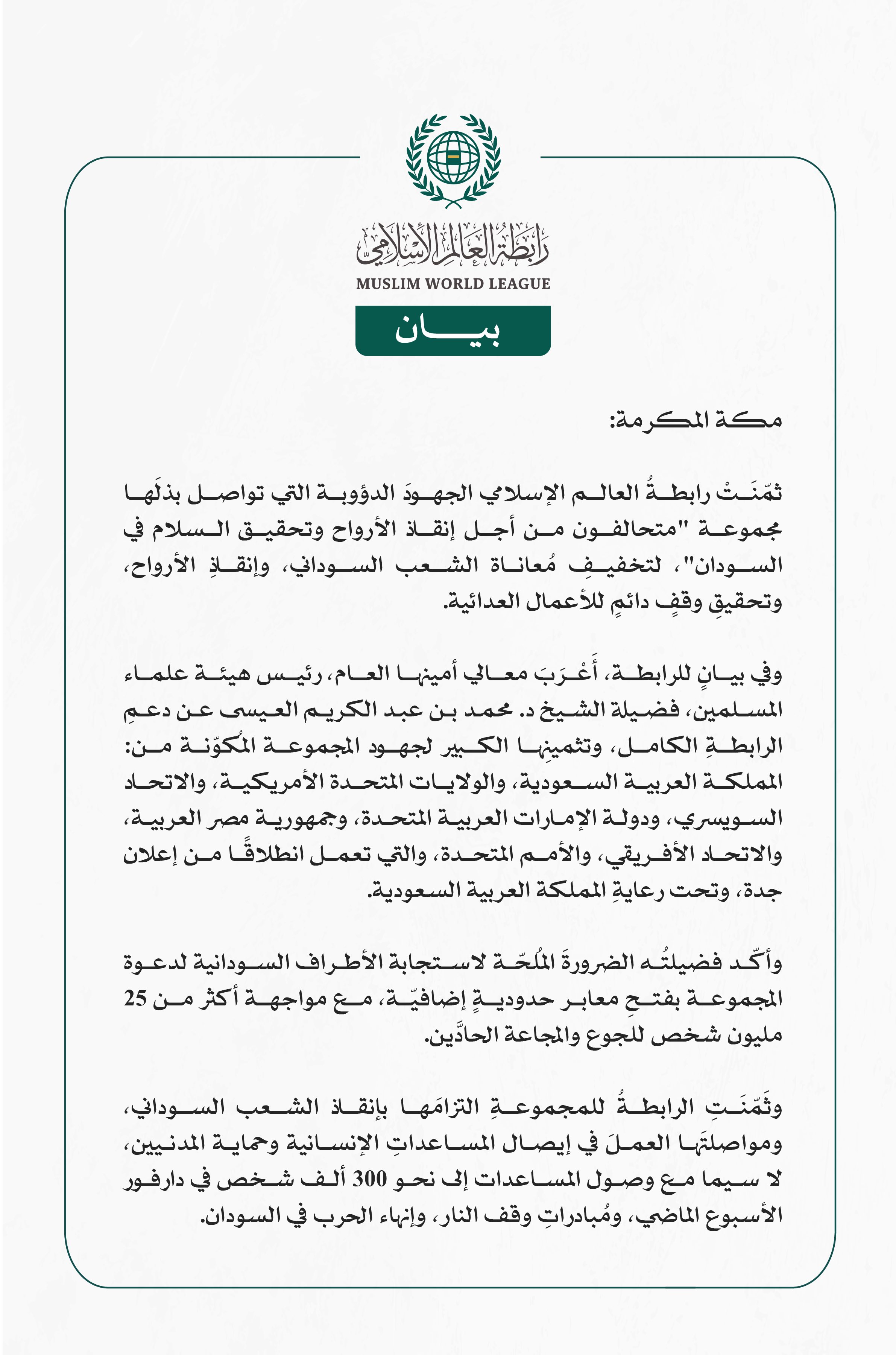 ثمّنَتْ رابطةُ العالم الإسلامي الجهودَ الدؤوبة التي تواصل بذلَها مجموعة "متحالفون من أجل إنقاذ الأرواح وتحقيق السلام في السودان"، لتخفيفِ مُعاناة الشعب السوداني، وإنقاذِ الأرواح، وتحقيقِ وقفٍ دائمٍ للأعمال العدائية.