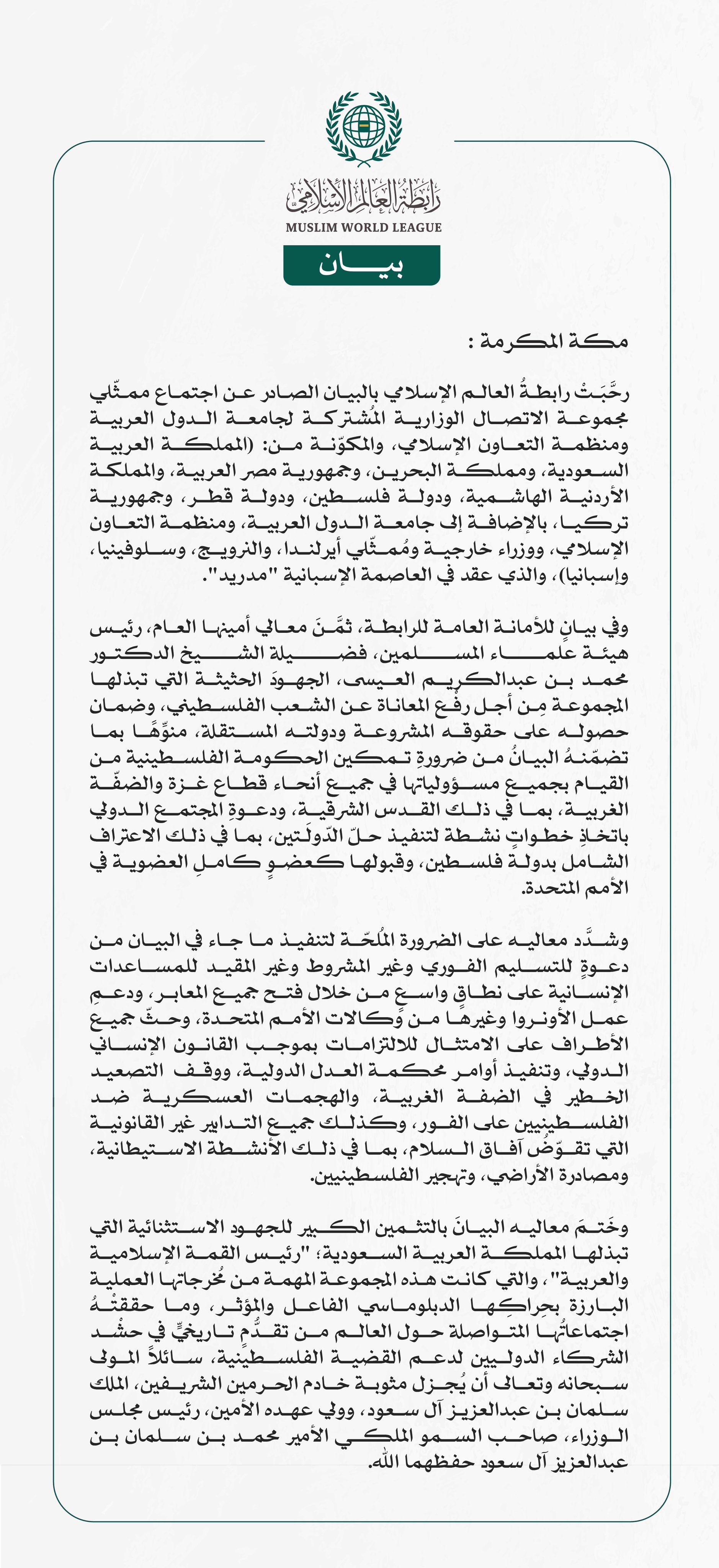 رحَّبَتْ رابطةُ العالم الإسلامي بالبيان الصادر عن اجتماع ممثّلي مجموعة الاتصال الوزارية المُشتركة لجامعة الدول العربية ومنظمة التعاون الإسلامي، والمكوّنة من: (المملكة العربية السعودية، ومملكة البحرين، وجمهورية مصر العربية، والمملكة الأردنية الهاشمية، ودولة فلسطين، ودولة قطر، وجمهورية تركيا، بالإضافة إلى جامعة الدول العربية، ومنظمة التعاون الإسلامي، ووزراء خارجية ومُمثّلي أيرلندا، والنرويج، وسلوفينيا، وإسبانيا)، والذي عقد في العاصمة الإسبانية "مدريد".