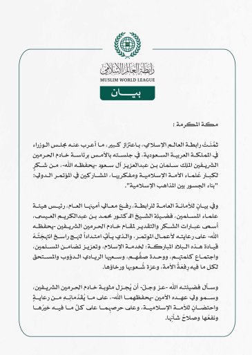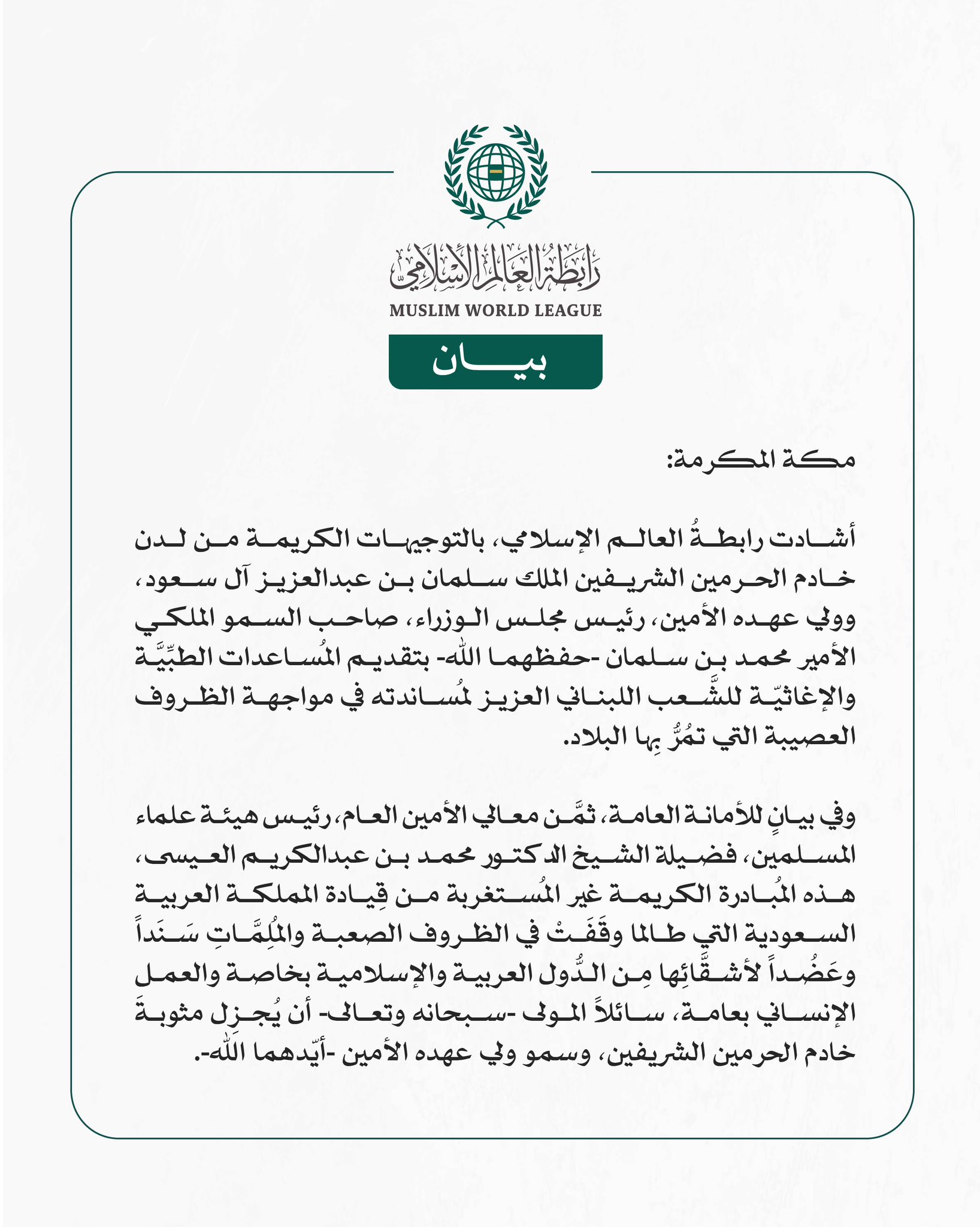أشادت رابطةُ العالم الإسلامي، بالتوجيهات الكريمة من لدن خادم الحرمين الشريفين الملك سلمان بن عبدالعزيز آل سعود، وولي عهده الأمين، رئيس مجلس الوزراء، صاحب السمو الملكي الأمير محمد بن سلمان -حفظهما الله- بتقديم المُساعدات الطبِّيَّة والإغاثيّة للشَّعب اللبناني العزيز لمُساندته في مواجهة الظروف العصيبة التي تمُرُّ بِها البلاد.