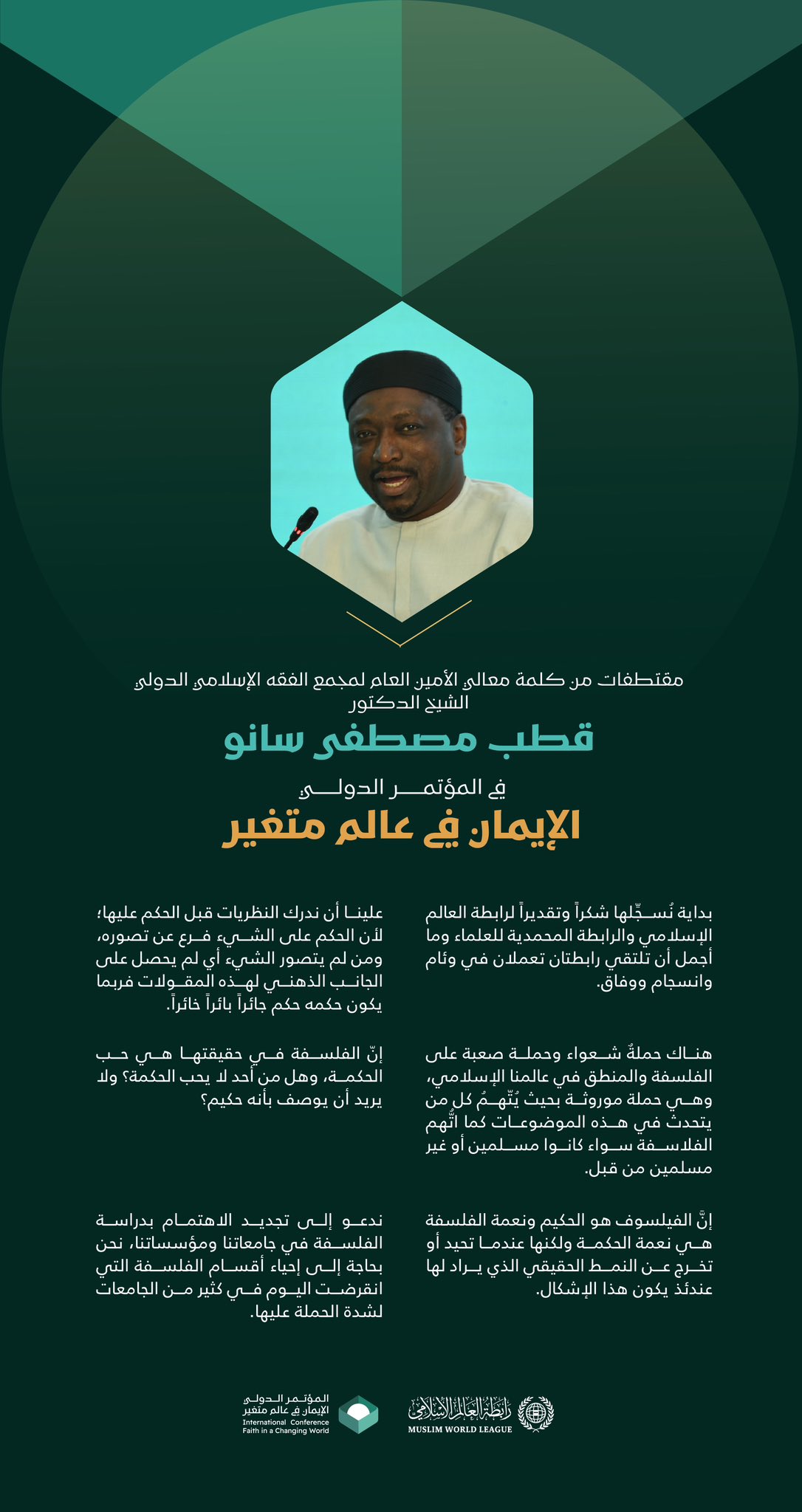 مقتطفات من كلمة معالي الأمين العام لمجمع الفقه الإسلامي الدولي الشيخ الدكتور قطب مصطفى سانو، في المؤتمر الدولي: "الإيمان في عالمٍ متغيِّر":