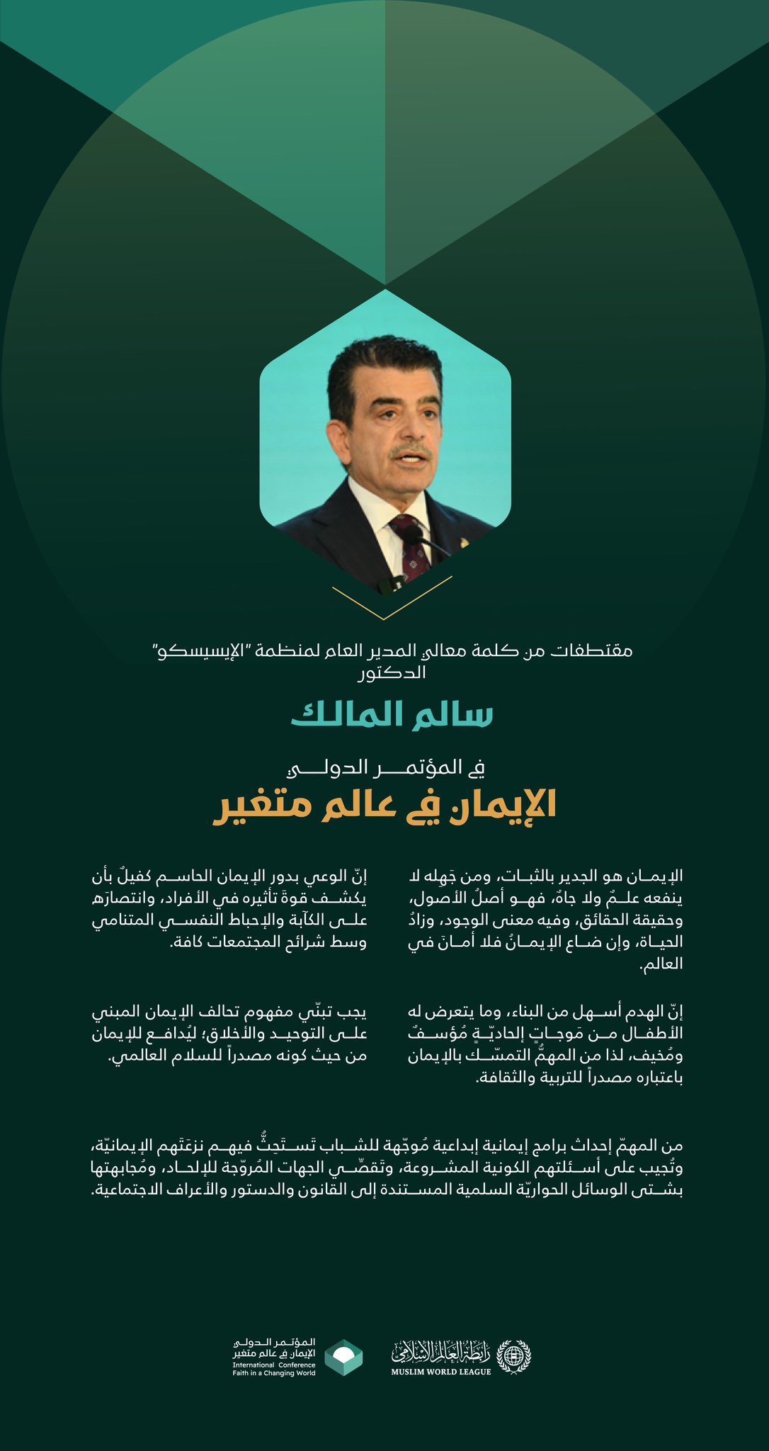 مقتطفات من كلمة معالي المدير العام لمنظمة "الإيسيسكو"، الدكتور سالم المالك، في المؤتمر الدولي: "الإيمان في عالَمٍ مُتغيِّر":