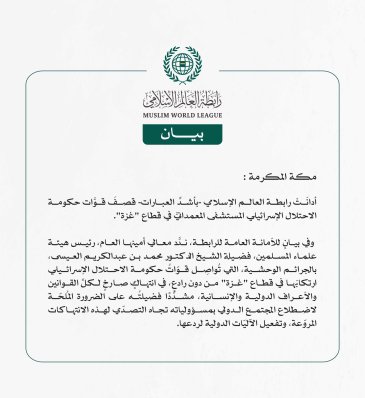 استنكرت رابطة العالم الإسلامي إعلانَ حكومة الاحتلال الإسرائيلي إنشاءَ وكالة لتهجير الفلسطينيين من قطاع غزّة، والمصادقةَ على فصل (13) حيًّا استيطانيًّا غير قانوني في الضفة الغربية، لإضفاء الشرعية عليها.