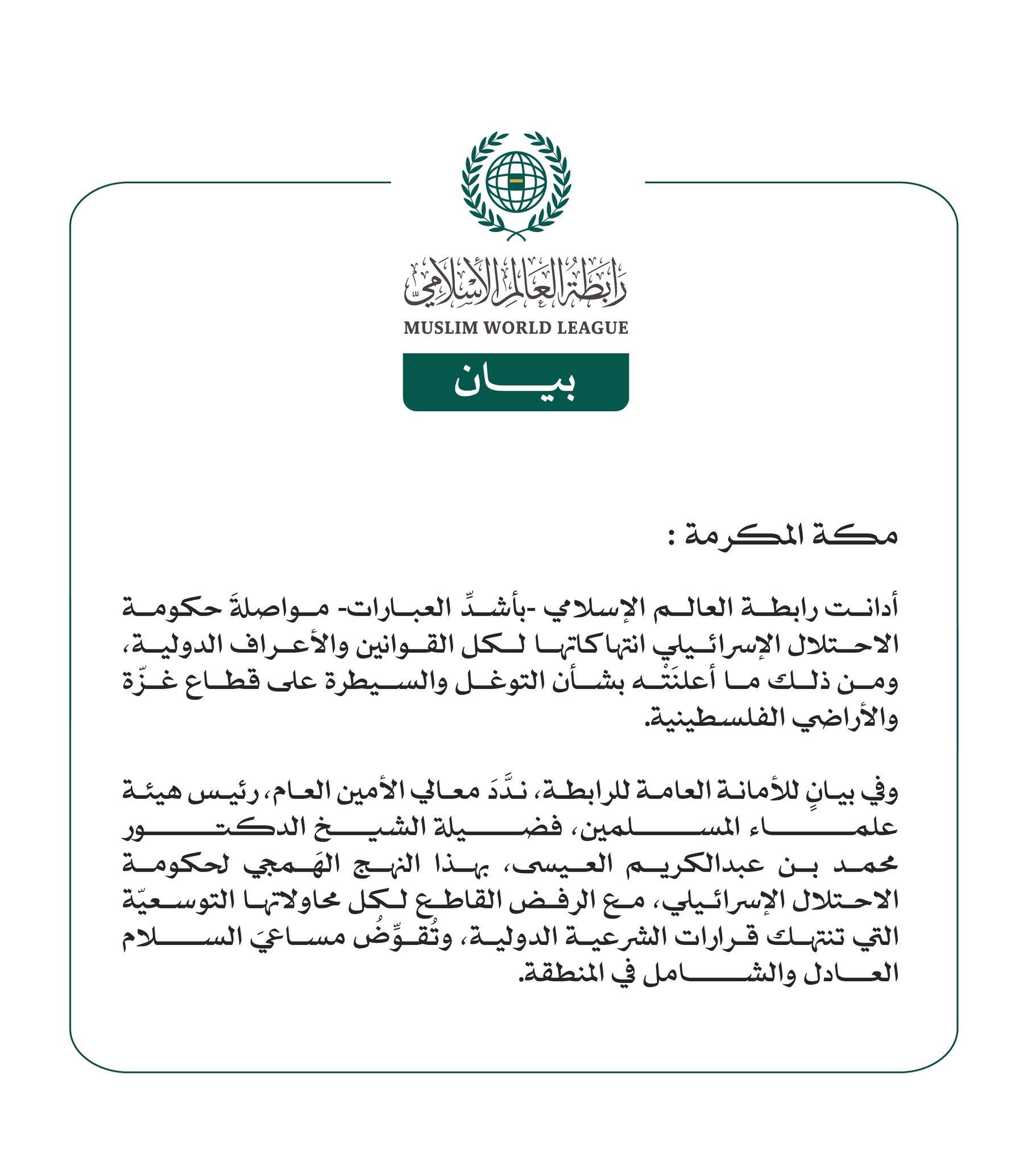 وفي بيانٍ للأمانة العامة للرابطة، ندَّدَ معالي الأمين العام، رئيس هيئة علماء المسلمين، فضيلة الشيخ الدكتور محمد بن عبدالكريم العيسى، بهذا النهج الهَمجي لحكومة الاحتلال الإسرائيلي، مع الرفض القاطع لكل محاولاتها التوسعيّة التي تنتهك قرارات الشرعية الدولية، وتُقوِّضُ مساعيَ السلام العادل والشامل في المنطقة.