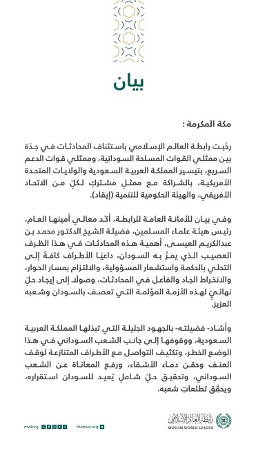 رابطةُ العالَم الإسلامي تثمّن جهودَ المملكة العربية السعودية والولايات المتحدة الأمريكية لإنهاء الحرب في السودان
