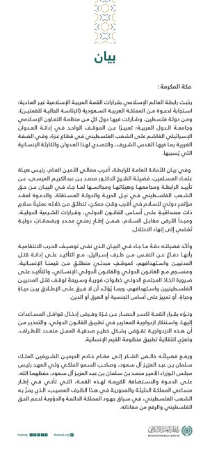رابطةُ العالم الإسلامي تُدين الانتهاكات الإسرائيلية المقوِّضة للاستقرار والسلام، وتدعو إلى إنفاذ القرارات الدولية و"إعلان نيويورك" لحلّ الدولتين