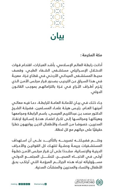 رابطةُ العالَم الإسلامي تُدين الهجمات الإجرامية على المستشفى السعودي بالفاشر