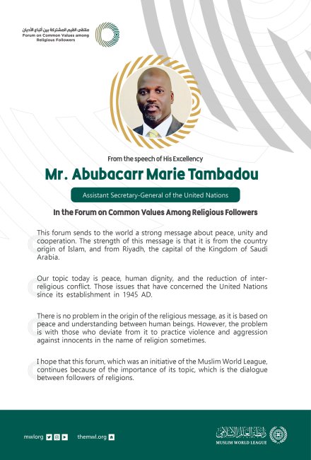 From the speech of the Assistant Secretary-General of the United Nations, His Excellency Mr. Abubacarr Marie Tambadou, in the Forum on Common Values Among Religious Followers in Riyadh: