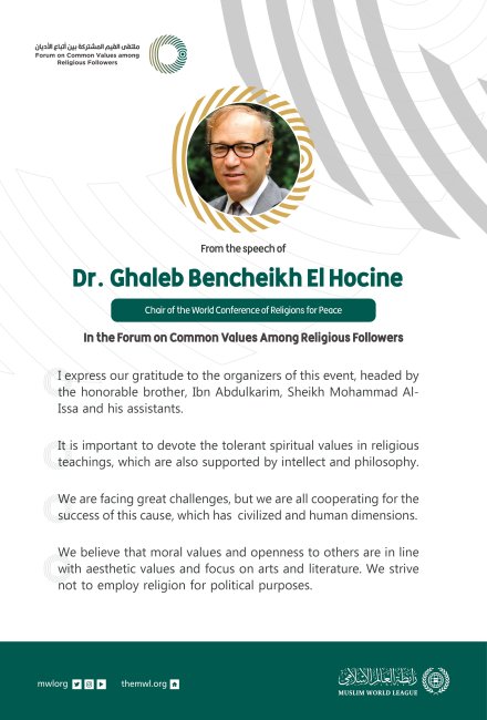 From the speech of the Chair of the World Conference of Religions for Peace, Dr. Ghaleb Bencheikh El Hocine, in the Forum on Common Values Among Religious Followers in Riyadh Faiths For Peace