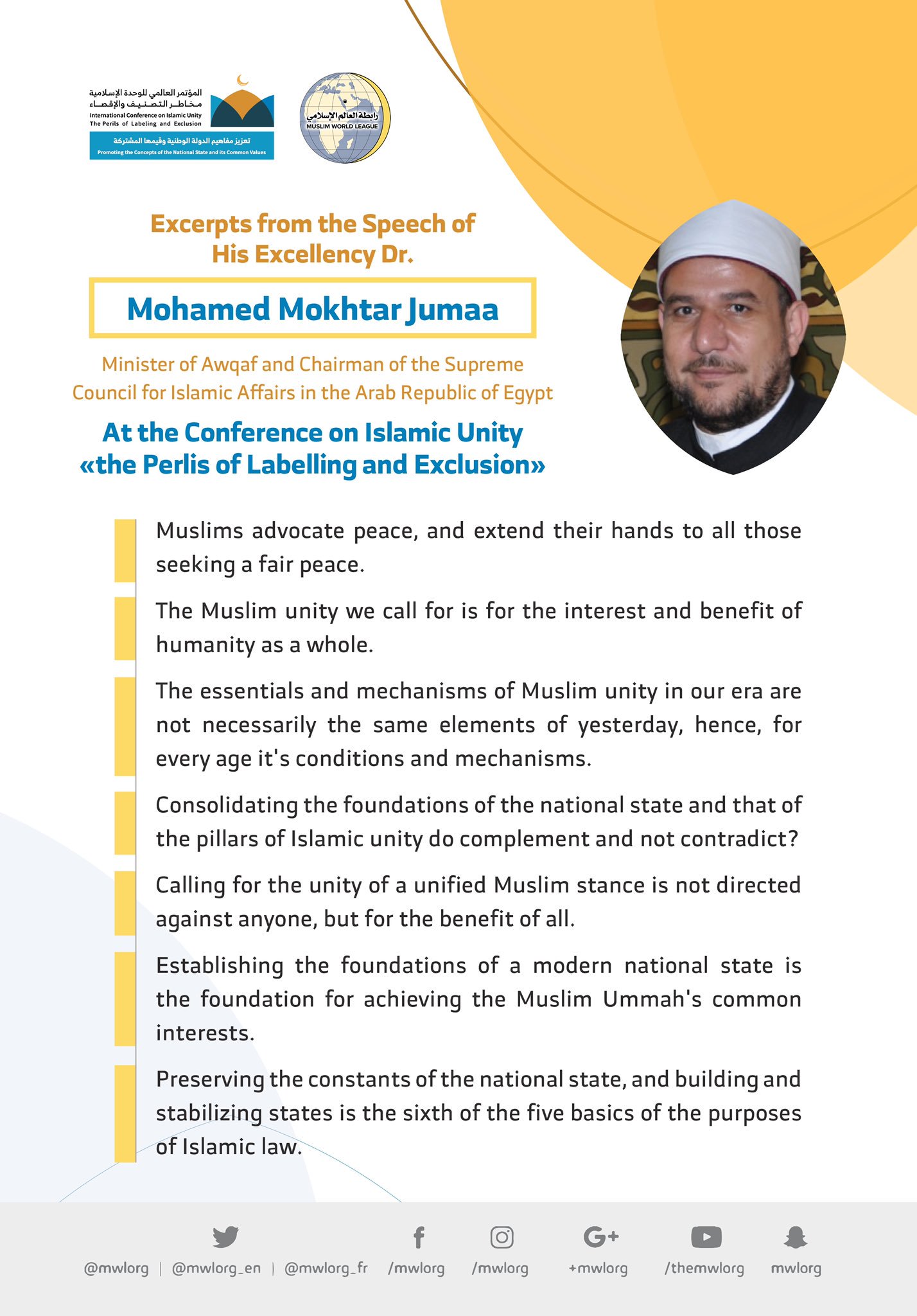 HE Dr. Mohamed Mokhtar Jumaa, Addresses 1200 Islamic figures from 127 countries & 28 Islamic components at the MWL conference on Islamic Unity: Perlis of Labeling & Exclusion, held in Makkah under the Patronage of the Custodian Of The Two Holy Mosques. Muslim Makkah Conference