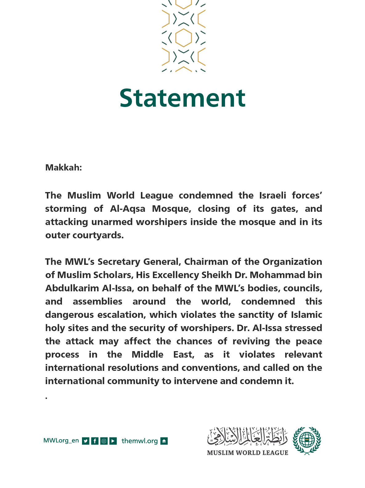 The Muslim World League Condemns Israeli Violations Undermining Stability and Peace, and Calls for Implementing International Resolutions and the “New York Declaration” for…