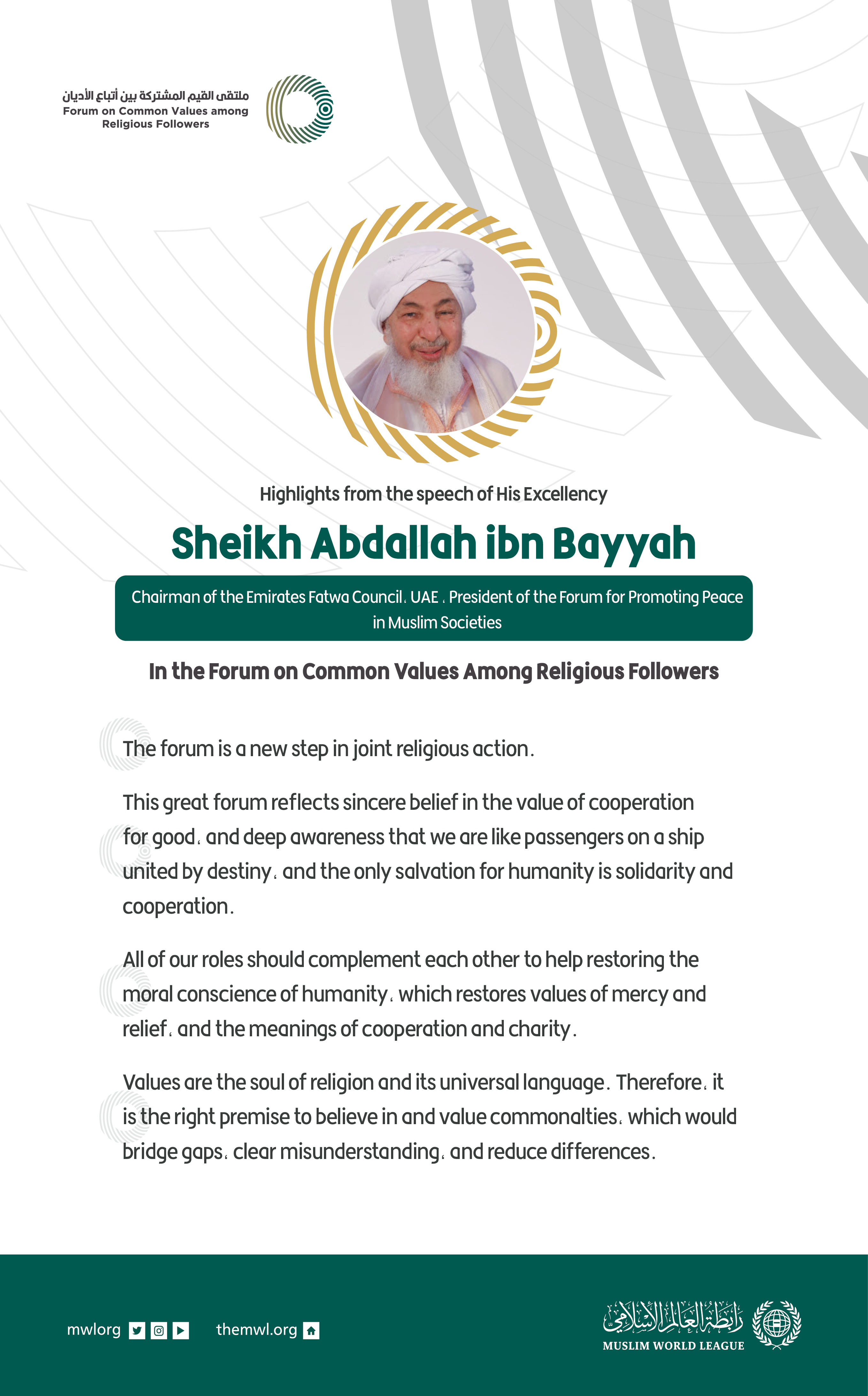 Highlights from the speech of His Excellency, Chairman of the Emirates Fatwa Council, UAE, Sheikh Abdallah ibn Bayyah in the Forum on Common Values Among Religious Followers in Riyadh: Faiths For Peace