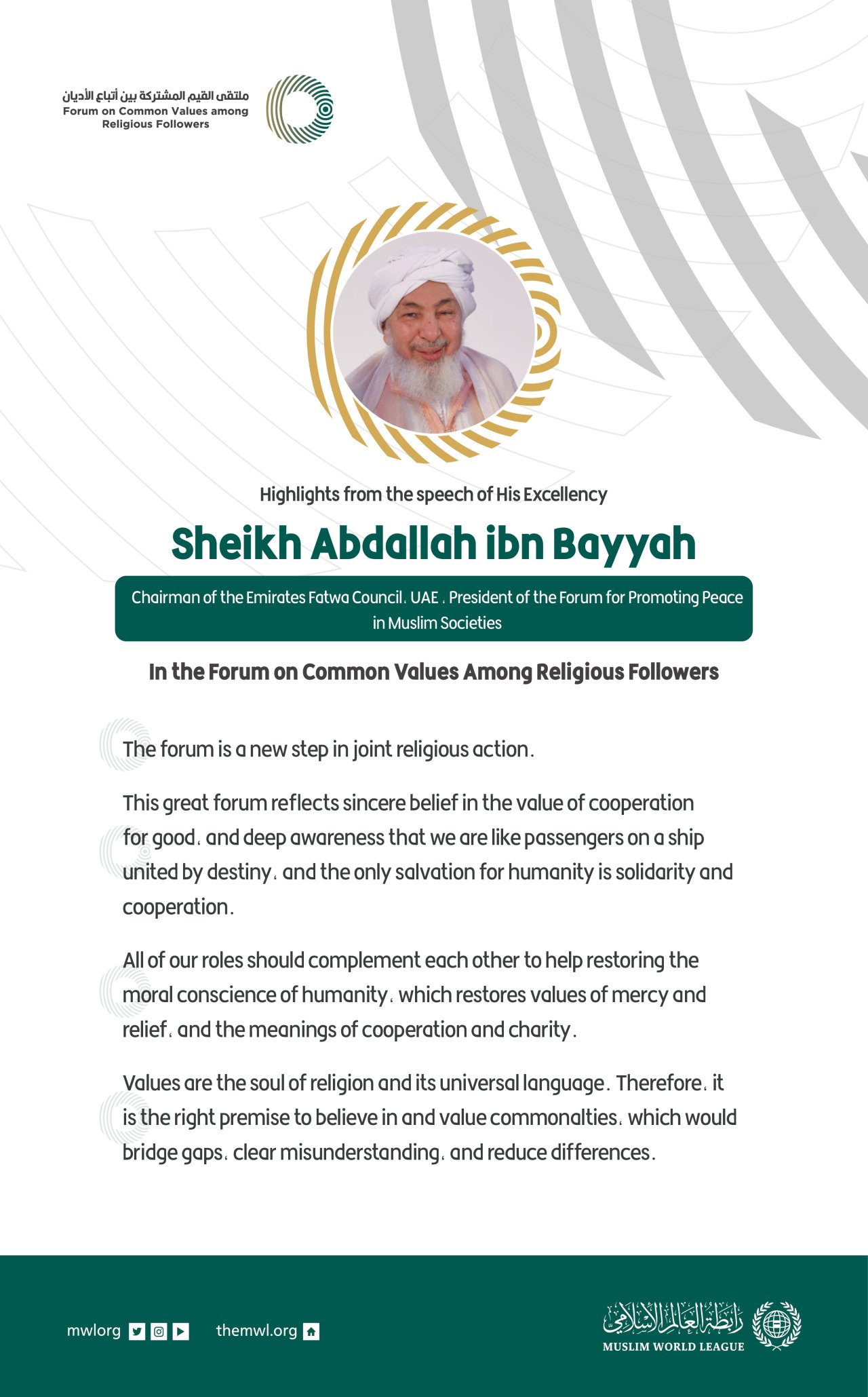 Highlights from the speech of His Excellency, Chairman of the Emirates Fatwa Council, UAE, Sheikh Abdallah ibn Bayyah in the Forum on Common Values Among Religious Followers in Riyadh:
