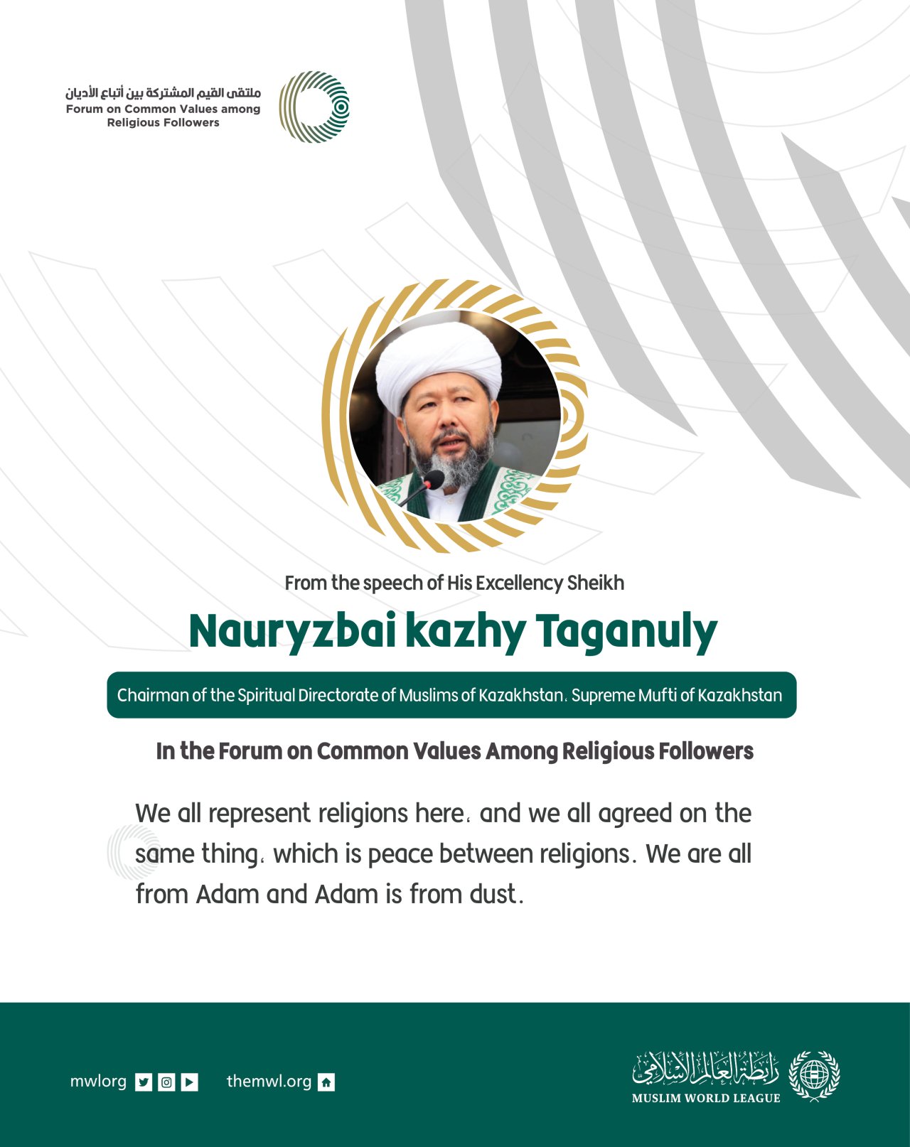 From the speech of His Excellency, Chairman of the Spiritual Directorate of Muslims of Kazakhstan, Supreme Mufti of Kazakhstan, Sheikh Nauryzbai kazhy Taganuly in the Forum on Common Values Among Religious Followers in Riyadh: