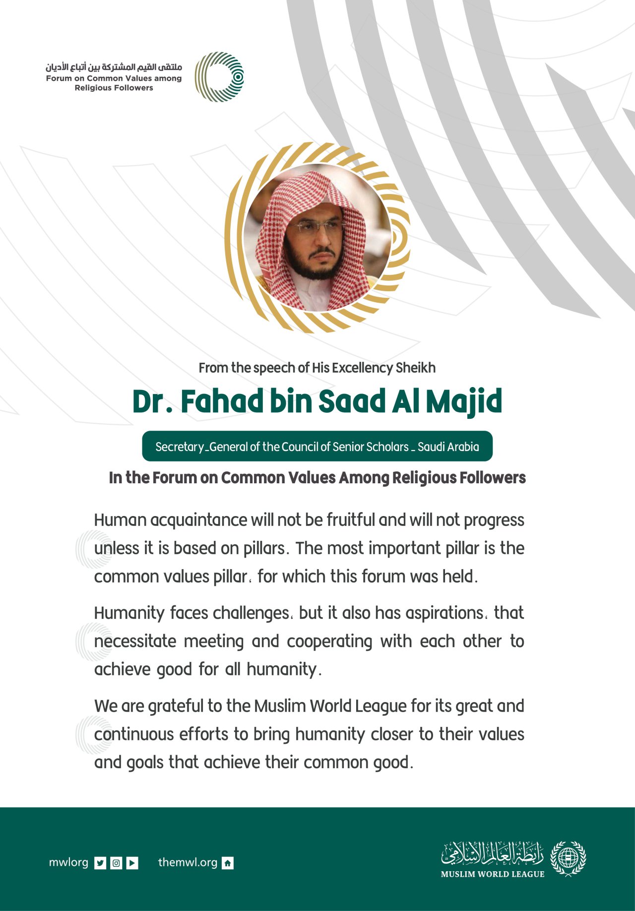 From the speech of His Excellency the Secretary-General of the Council of Senior Scholars in Saudi Arabia, Sheikh Dr. Fahad bin Saad Al Majid, in the Forum on Common Values Among Religious Followers in Riyadh: