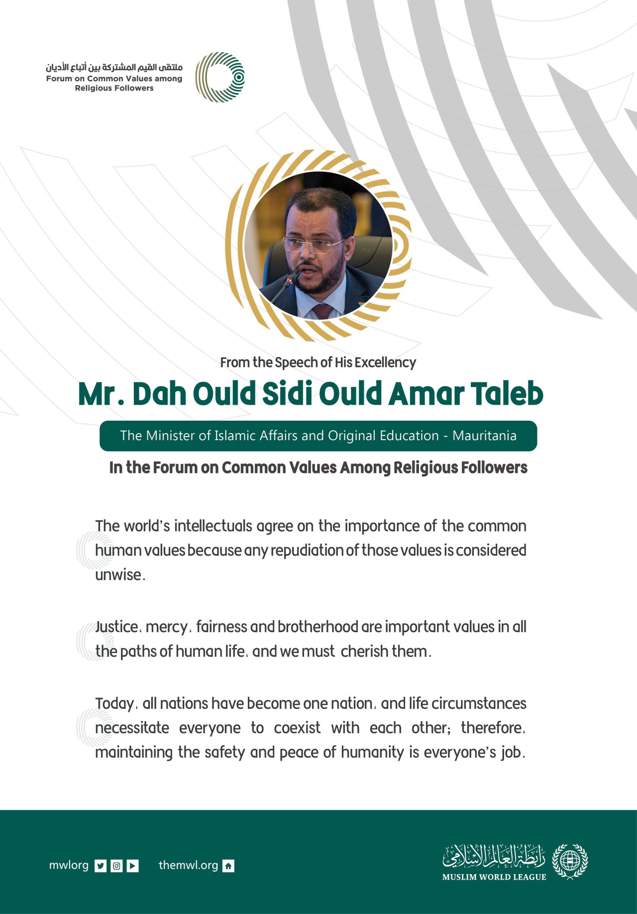 From the Speech of The Minister of Islamic Affairs and Original Education in Mauritania. His Excellency Mr. Dah Ould Sidi Ould Amar Taleb, in the Forum on Common Values Among Religious Followers in Riyadh: