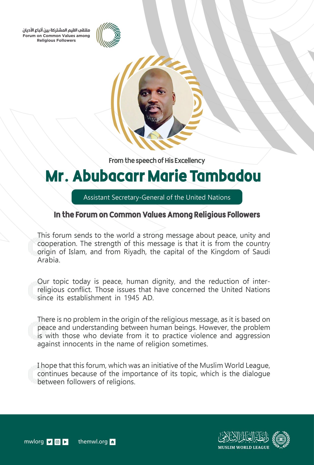 From the speech of the Assistant Secretary-General of the United Nations, His Excellency Mr. Abubacarr Marie Tambadou, in the Forum on Common Values Among Religious Followers in Riyadh: