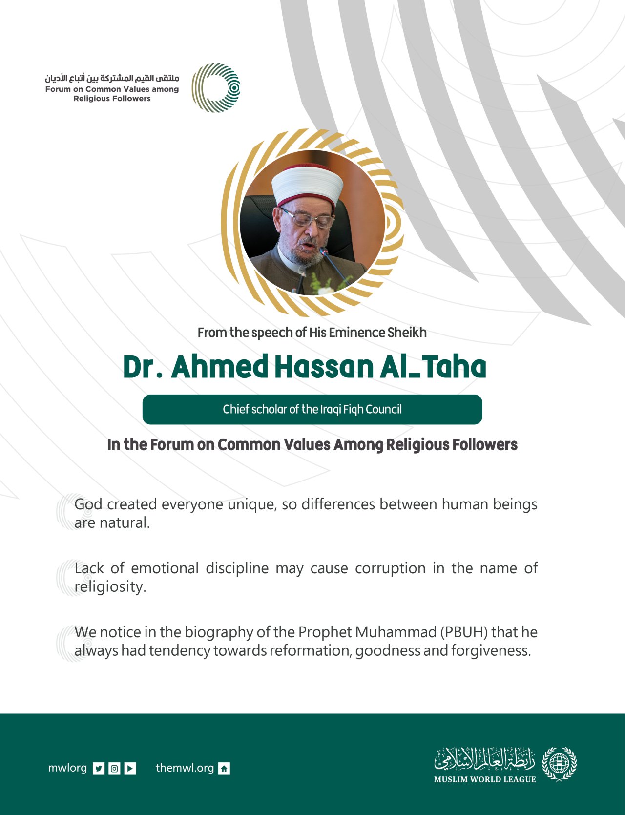 From the speech of the Chief scholar of the Iraqi Fiqh Council His Eminence, Sheikh Dr. Ahmed Hassan Al-Taha, in the Forum on Common Values Among Religious Followers in Riyadh: