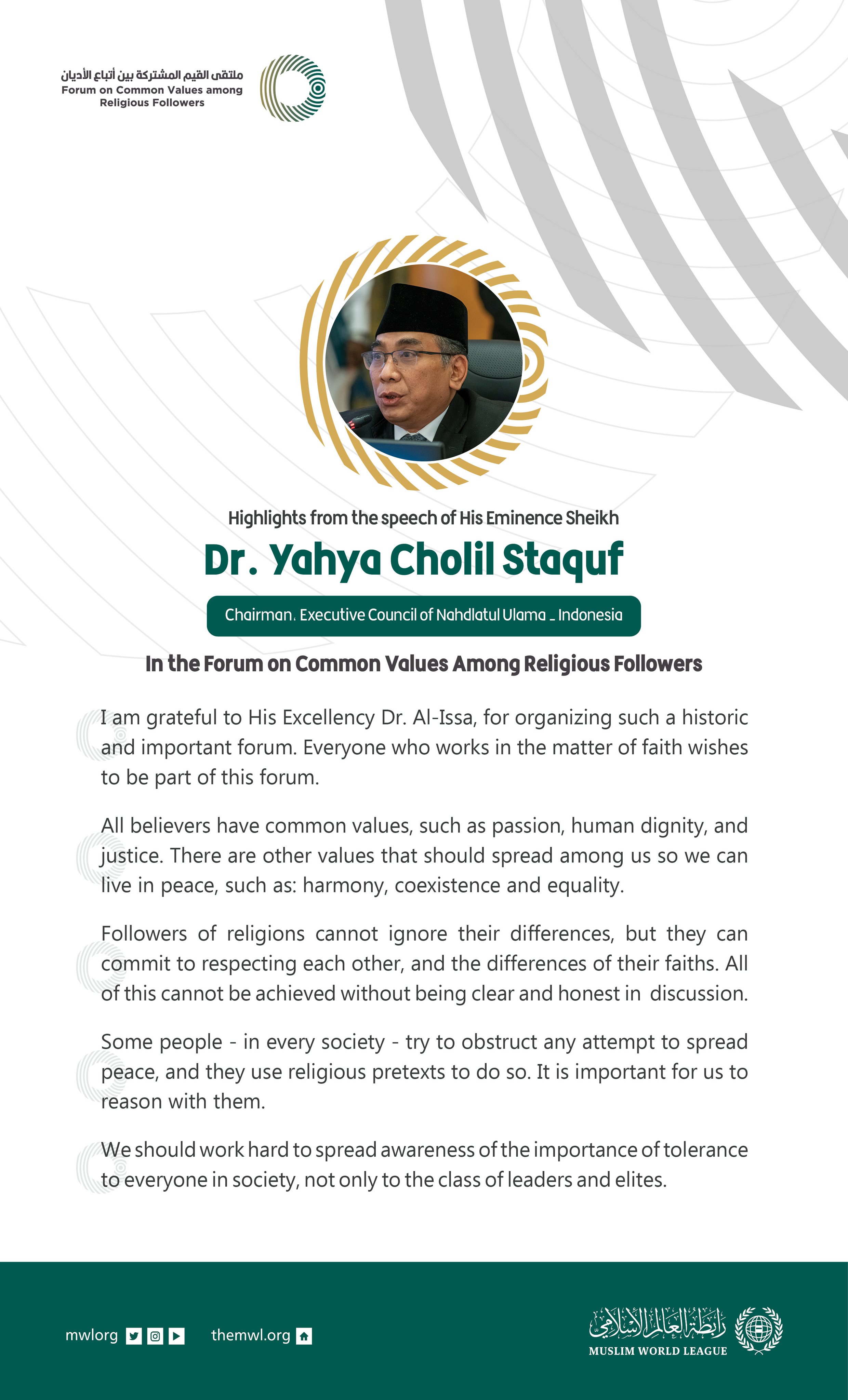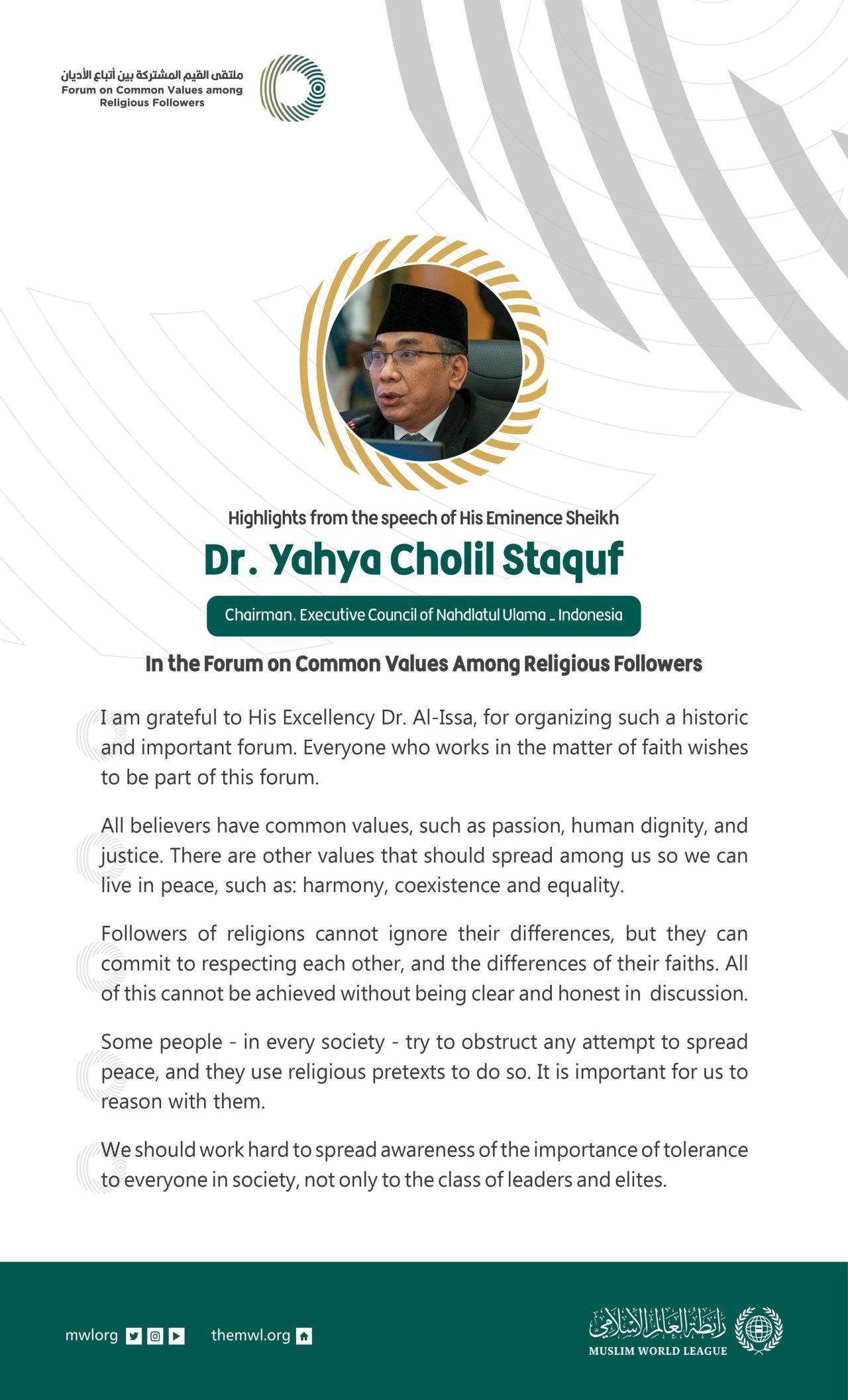 Highlights from the speech of the Chairman of the Executive Council of Nahdlatul Ulama - Indonesia, His Eminence Sheikh Dr. Yahya Cholil Staquf, in the Forum on Common Values Among Religious Followers in Riyadh: Faiths For Peace
