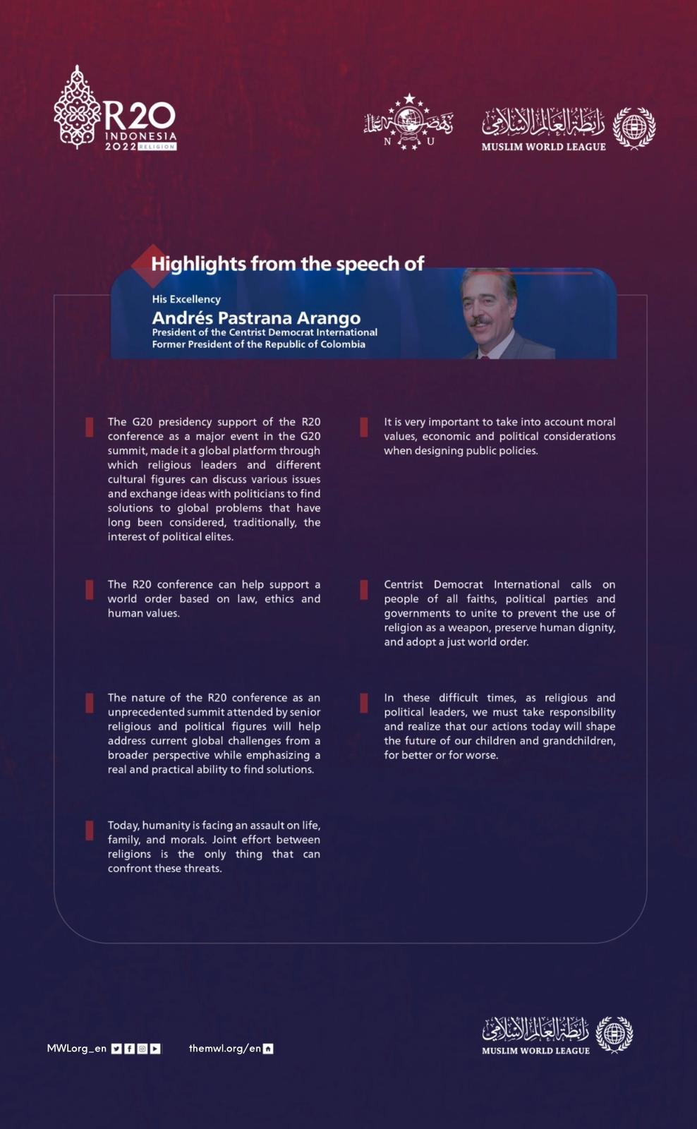 Highlights from the speech of President of the Centrist Democrat International, Former President of the Republic of Colombia, His Excellency Andrés Pastrana Arango, during the R20 Summit in Bali: