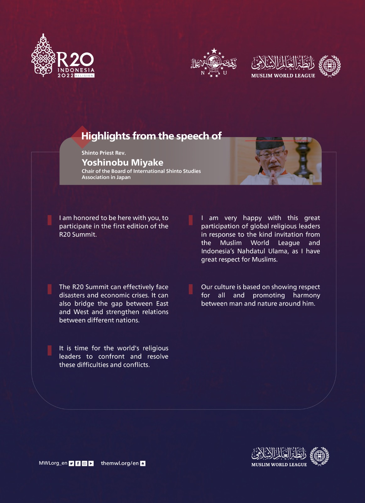 Highlights from the speech of the Chair of the Board of International Shinto Studies Association in Japan, the Shinto priest Rev. Yoshinobu Miyake, at the R20 Summit in Bali:
