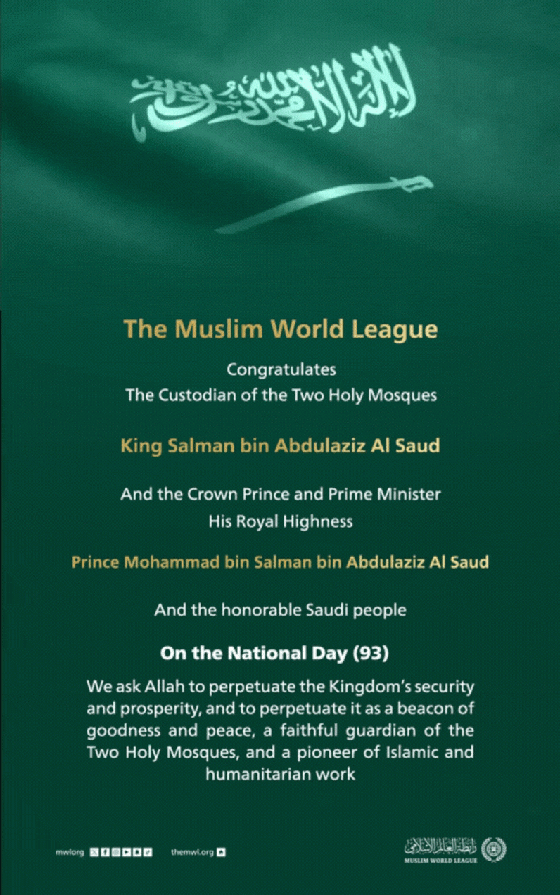The Muslim World League congratulates the Custodian of the Two Holy Mosques, His Royal Highness the Crown Prince, and the honorable Saudi people on Saudi National Day
