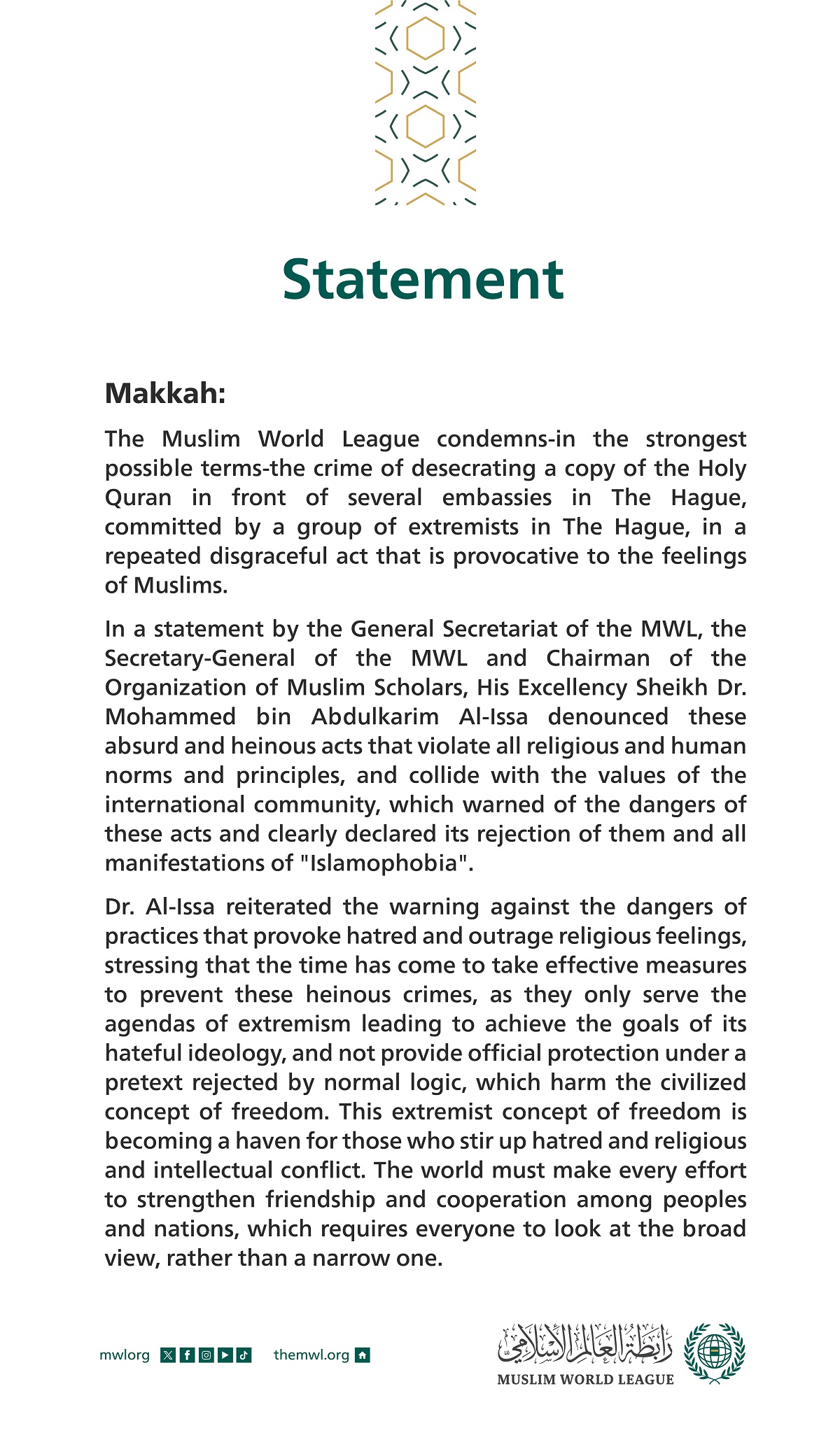 The Muslim World League condemns-in the strongest possible terms-the crime of desecrating a copy of the Holy Quran in front of several embassies in The Hague, committed by a group of extremists in The Hague, in a repeated disgraceful act that is provocative to the feelings of Muslims.