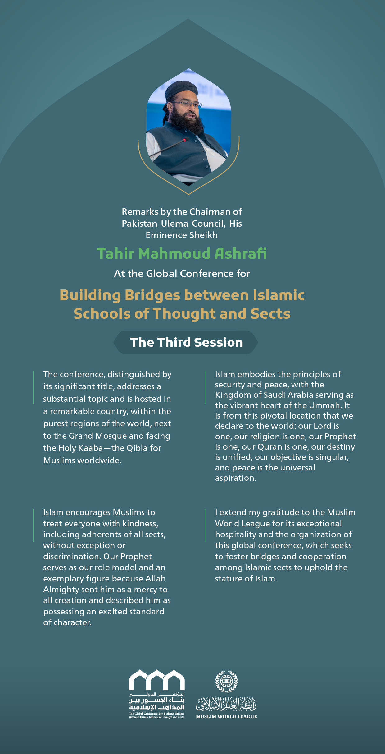 “One Ummah”. Remarks by His Eminence Sheikh Tahir Mahmoud Ashrafi, Chairman of Pakistan Ulema Council, at the Global Conference for Building Bridges between Islamic Schools of Thought and Sects.