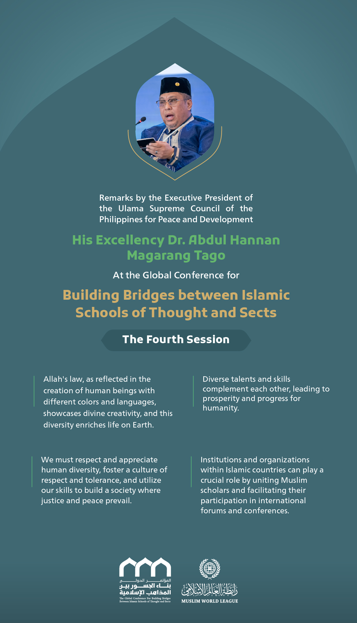 Remarks by His Excellency Dr. Abdul Hannan Magarang Tago, the Executive President of the Ulama Supreme Council of the Philippines for Peace and Development, at the Global Conference for Building Bridges between Islamic Schools of Thought and Sects.
