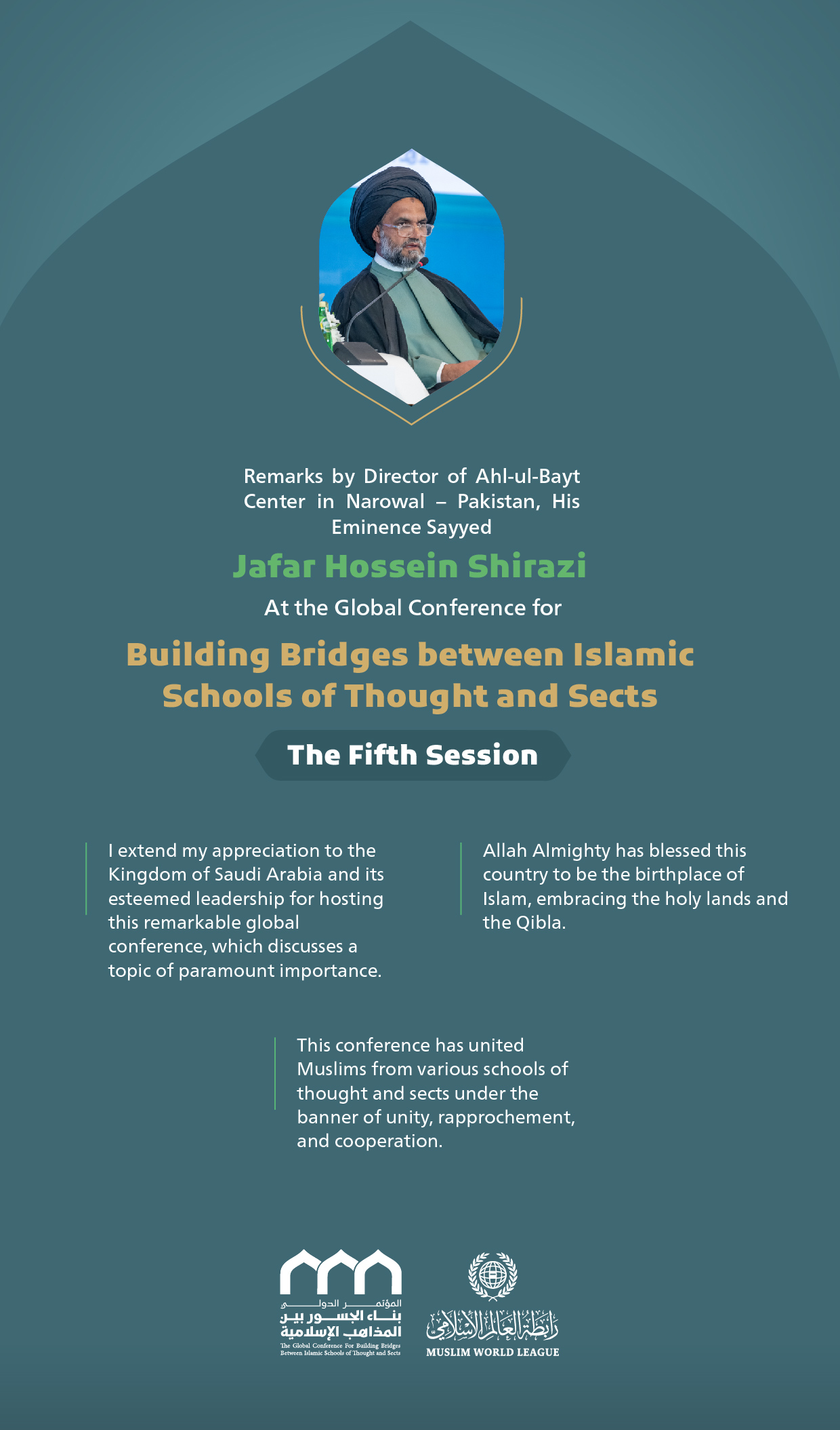 Remarks by His Eminence Sayyed Jafar Hossein Shirazi, Director of Ahl-ul-Bayt Center in Narowal, Pakistan, at the Global Conference for Building Bridges between Islamic Schools of Thought and Sects.